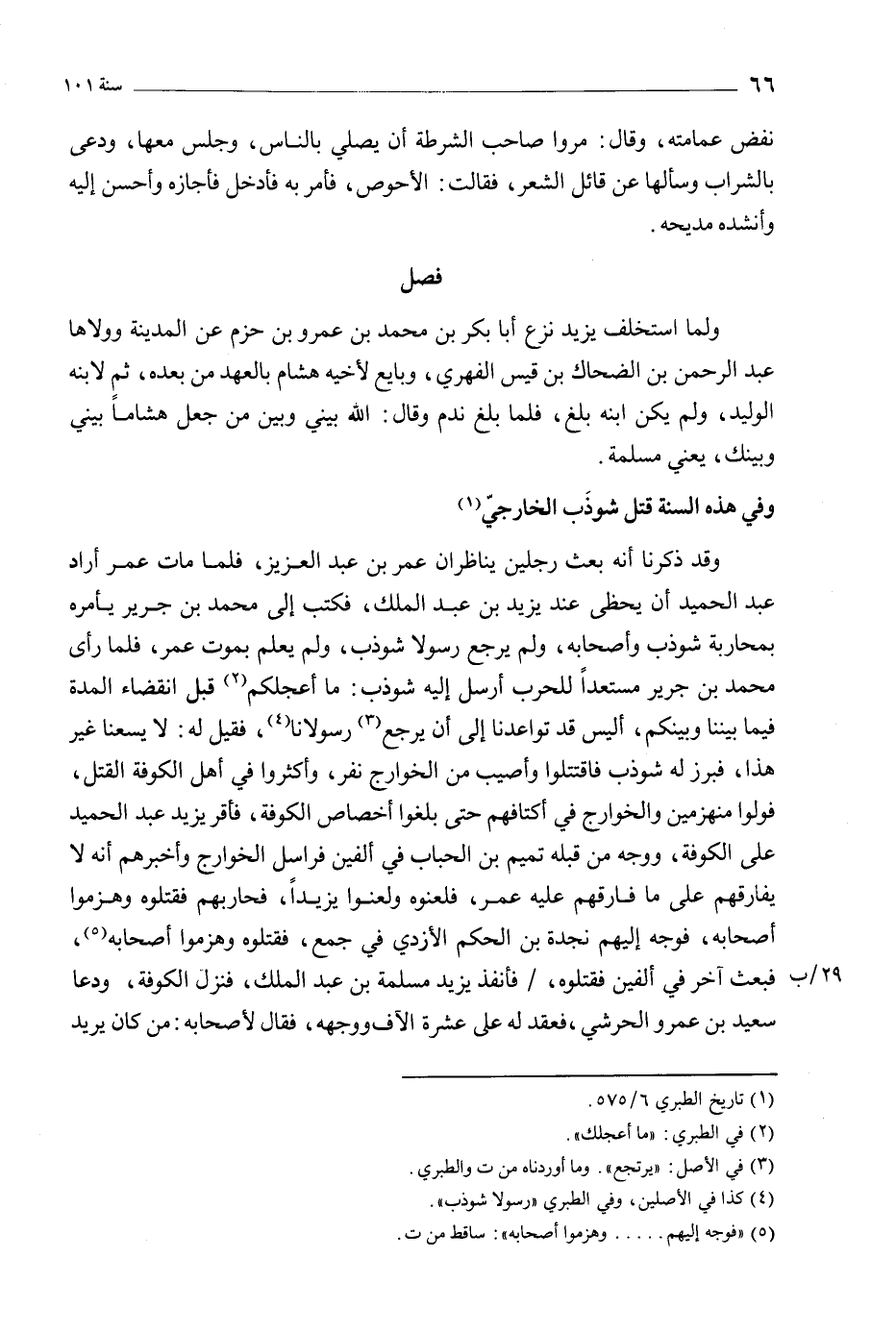 وقد ذكرنا أنه بعث رجلين يناظران عمر بن عبد العزيز، فلما مات عمر أراد عبد الحميد أن يحظى عند يزيد بن عبد الملك، فكتب إلى محمد بن جرير يأمره بمحاربة شوذب وأصحابه، ولم يرجع رسولا شوذب، ولم يعلم بموت عمر، فلما رأى محمد بن جرير مستعدا للحرب أرسل إليه شوذب: ما أعجلكم [2] قبل انقضاء المدة فيما بيننا وبينكم، أليس قد تواعدنا إلى أن يرجع [3] رسولانا [4] ، فقيل له: لا يسعنا غير هذا، فبرز له شوذب فاقتتلوا وأصيب من الخوارج نفر، وأكثروا في أهل الكوفة القتل، فولوا منهزمين والخوارج في أكتافهم حتى بلغوا أخصاص الكوفة، فأقر يزيد عبد الحميد على الكوفة، ووجه من قبله تميم بن الحباب في ألفين فراسل الخوارج وأخبرهم أنه لا يفارقهم على ما فارقهم عليه عمر، فلعنوه ولعنوا يزيدا، فحاربهم فقتلوه وهزموا أصحابه، فوجه إليهم نجدة بن الحكم الأزدي في جمع، فقتلوه وهزموا أصحابه [5] ، فبعث آخر في ألفين فقتلوه، فأنفذ يزيد مسلمة بن عبد الملك، فنزل الكوفة، ودعا سعيد بن عمرو الحرشي، فعقد له على عشرة آلاف ووجهه، فقال لأصحابه: من كان يريد
