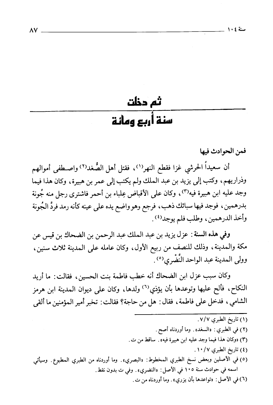 [5] في الأصلين وبعض نسخ الطبري المخطوط: «البصري» . وما أوردناه من الطبري المطبوع. وسيأتي اسمه في حوادث سنة 105 في الأصل: «النضري» . وفي ت بدون نقط.