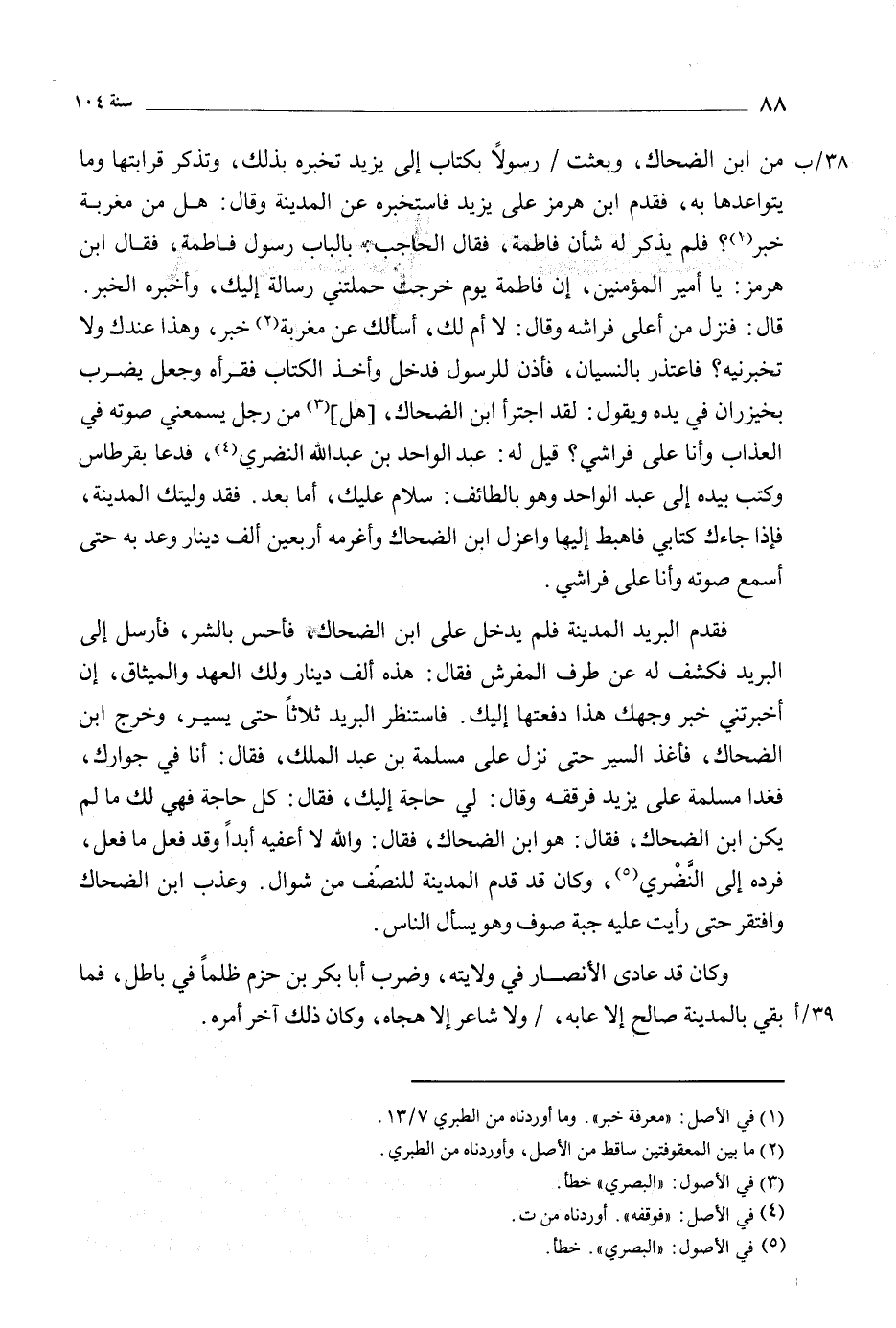 فقدم البريد المدينة فلم يدخل على ابن الضحاك، فأحس بالشر، فأرسل إلى البريد فكشف له عن طرف المفرش فقال: هذه ألف دينار ولك العهد والميثاق، إن أخبرتني خبر وجهك هذا دفعتها إليك. فاستنظر البريد ثلاثا حتى يسير، وخرج ابن الضحاك، فأغذ السير حتى نزل على مسلمة بن عبد الملك، فقال: أنا في جوارك، فغدا مسلمة على يزيد فرققه وقال: لي حاجة إليك، فقال: كل حاجة فهي لك ما لم يكن ابن الضحاك، فقال: هو ابن الضحاك، فقال: والله لا أعفيه أبدا وقد فعل ما فعل، فرده إلى النضري [5] ، وكان قد قدم المدينة للنصف من شوال. وعذب ابن الضحاك وافتقر حتى رأيت عليه جبة صوف وهو يسأل الناس.