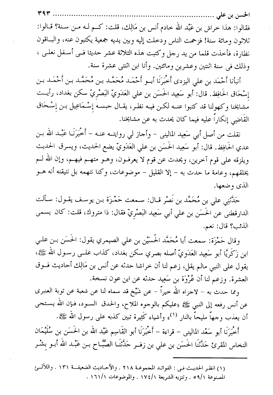 وَقَالَ حمزة: سمعت أبا محمّد الحسين بن علي الصيمري يقول: الحسن بن علي ابن زكريا أَبُو سعيد العدوي أصله بصري سكن بغداد، كذاب عَلَى رَسُول اللَّهِ صَلَّى اللَّهُ عَلَيْهِ وَسَلَّمَ، يَقُولُ عَلَى النَّبِيّ ما لم يقل، زعم لنا أن خراشا حدثه عَنْ أنس بن مالك أحاديث فوق العشرة. وزعم لنا أن عروة بن سعيد حدثه عَنِ ابن عون نسخة.