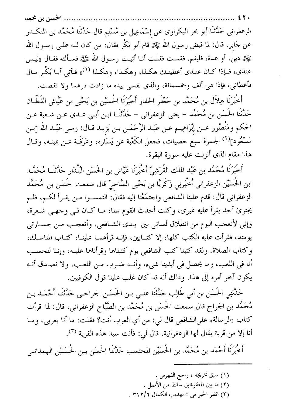 حَدَّثَنِي الْحَسَن بن أَبِي طالب حدّثنا علي بن الحسن الجراحي حَدَّثَنَا أَحْمَدُ بْنُ مُحَمَّد بن الجراح قَالَ سمعت الْحَسَنُ بْنُ مُحَمَّدِ بْنِ الصَّبَّاحِ الزَّعْفَرَانِيُّ. قَالَ: لما قرأت كتاب «الرسالة» عَلَى الشافعي قَالَ لي: من أي العرب أنت؟ فقلت: ما أنا بعربي، وما أنا إلا من قرية يقال لها الزعفرانية. قال لي: فأنت سيد هذه القرية [3] .