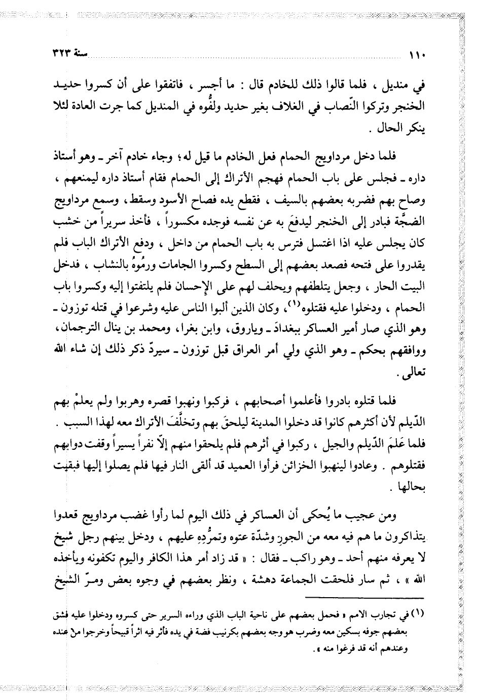 فلما دخل مرداويج الحمام فعل الخادم ما قيل له وجاء خادم آخر وهو أستاذ داره فجلس على باب الحمام فهجم الأتراك إلى الحمام فقام أستاذ داره ليمنعهم وصاح بهم فضربه بعضهم بالسيف فقطع يده فصاح الأسود وسقط وسمع مرداويج الضجة فبادر إلى الخنجر ليدفع به عن نفسه فوجده مكسورا فأخد سريرا من خشب كان يجلس عليه إذا اغتسل فترس به باب الحمام من داخل ودفع الأتراك الباب فلم يقدروا على فتحه فصعد بعضهم إلى السطح وكسروا الجامات ورموه بانشاب فدخل البيت الحار وجعل يتلطفهم ويحلف لهم على الإحسان فلم يلتفتوا إليه وكسروا باب الحمام ودخلوا عليه فقتلوه وكان الذين ألبوا الناس عليه وشرعوا في قتله توزون وهو الذي صار أمير العساكر ببغداد وياروق وابن بغرا ومحمد بن ينال الترجمان ووافقهم بحكم وهو الذي ولي أمر العراق قبل توزون سيرد ذلك إن شاء الله تعإلى