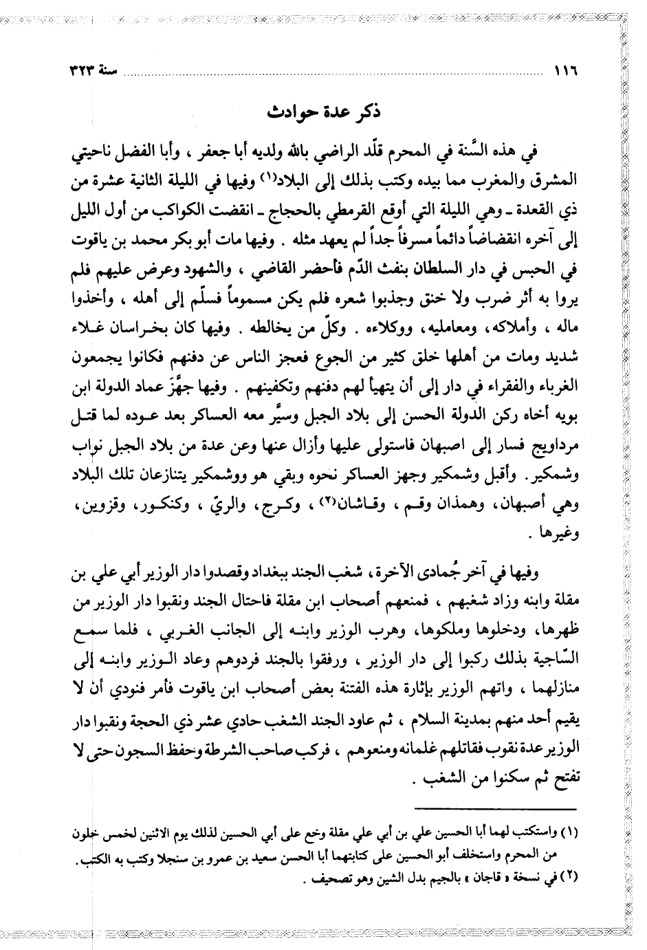 في هذه السنة في المحرم قلد الراضي بالله ولديه أبا جعفر وأبا الفضل ناحيتي المشرق والمغرب مما بيده وكتب بذلك إلى البلاد وفيها في الليلة الثانية عشرة من ذي القعدة وهي الليلة التي أوقع القرمطي بالحجاج انقضت الكواكب من أول الليل إلى آخره انقضاضا دائما مسرفا جدا لم يعهد مثله وفيها مات أبو بكر محمد ياقوت في الحبس في دار السلطان بنفث الدم فأحضر القاضي والشهود وعرض عليهم فلم يروا به أثر ضرب ولا خنق وجذبوا شعره فلم يكن مسموما فسلم إلى اهله وأخذوا ماله وأملاكه ومعامليه ووكلاءه وكل من يخالطه وفيها كان بخراسان غلاء شديد ومات من أهلها خلق كثير من الجوع فعجز الناس عن دفنهم فكانوا يجمعون الغرباء والفقراء في دار إلى أن يتهيأ لهم دفنهم وتكفينهم وفيها جهز عماد الدولة ابن بويه اخاه ركن الدولة الحسن إلى بلاد الجبل وسير معه العساكر بعد عوده لما قتل مرداويج فسار إلى أصبهان فاستولى عليها وازال عنها وعن عدة من بلاد الجبل نواب وشمكير وأقبل وشمكير وجهز العساكر نحوه وبقي هو ووشمكير يتنازعان تلك البلاد وهي أصبهان وهمذان وقم وقاشان وكرج والري وكنكور وقزوين وغيرها