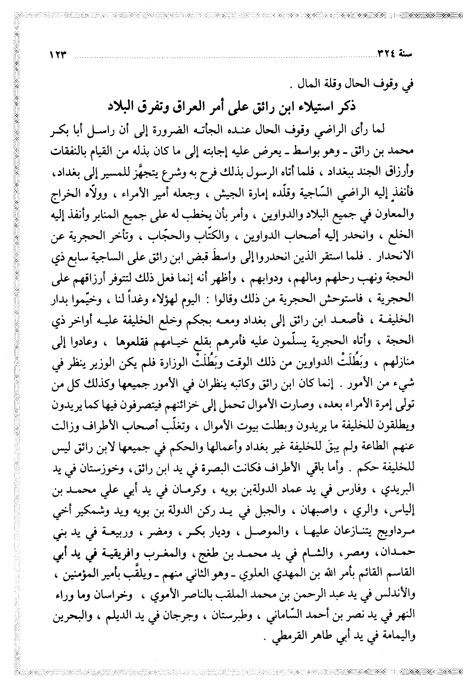 لما رأى الراضي وقوف الحال عنده الجأته الضرورة إلى أن راسل أبا بكر محمد بن رائق وهو بواسط يعرض عليه إجابته إلى ما كان بذله من القيام بالنفقات وأرزاق الجند ببغداد فلما أتاه الرسول بذلك فرح به وشرع يتجهز للمسير إلى بغداد فأنفذ إليه الراضي الساجية وقلده إمارة الجيش وجعله أمير إلامراء وولاه الخراج والمعاون في جميع البلاد والدواوين وأمر بأن يخطب له على جميع المنابر وأنفذ إليه الخلع وانحدر إليه أصحاب الدواوين والكتاب والحجاب وتأخر الحجرية عن إلانحدار فلما استقر الذين انحدروا إلى واسط قبض ابن رائق على الساجية سابع ذي الحجة ونهب رحلهم ومالهم ودوابهم وأظهر أنه إنما فعل ذلك لتتوفر أرزاقهم على الحجرية فاستوحش الحجرية من ذلك وقالوا اليوم لهؤلاء وغدا لنا وخيموا بدار الخليفة فأصعد ابن رائق إلى بغداد ومعه بجكم وخلع الخليفة عليه أواخر ذي الحجة وأتاه الحجرية يسلمون عليه فأمرهم بقلع خيامهم فقلعوها وعادوا إلى منازلهم وبطلت الدواوين من ذلك الوقت وبطلت الوزارة فلم يكن الوزير ينظر في شيء من إلامور إنما كان ابن رائق وكاتبه ينظران في إلامور جميعها وكذلك كل من تولى إمرة إلامراء بعده وصارت إلاموال تحمل إلى خزائنهم فيتصرفون فيها كما يريدون ويطلقون للخليفة ما يريدون وبطلت بيوت إلاموال وتغلب أصحاب إلاطراف وزالت عنهم الطاعة ولم يبق للخليفة غير بغداد وأعمالها والحكم في جميعها لابن رائق ليس للخليفة حكم وأما باقي إلاطراف فكانت البصرة في يد ابن رائق وخوزستان في يد البريدي وفارس في يد عماد الدولة بن يويه وكرمان في يد أبي علي محمد بن إلياس والري وأصبهان والجبل في يد ركن الدولة بن يويه ويد وشمكير أخي مرداويج يتنازعان عليها والموصل وديار بكر ومضر وربيعة في يد بني حمدان ومصر والشام في يد محمد بن طغج والمغرب وافريقية في يد أبي القاسم القائم بأمر الله بن المهدي العلوي وهو الثاني منهم ويلقب بأمير المؤمنين وإلاندلس في يد عبد الرحمن بن محمد الملقب بالناصر إلاموي وخراسان وما وارء النهر في يد نصر بن أحمد الساماني وطبرستان وجرجان في يد الديلم والبحرين واليمامة في يد أبي طاهر القرمطي