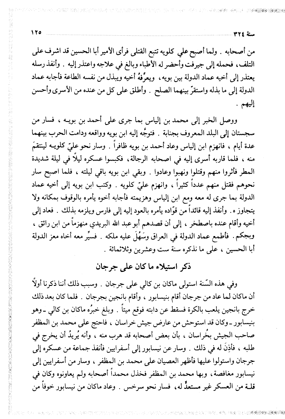 وفي هذه السنة استولى ماكان بن كالي على جرجان وسبب ذلك أننا ذكرنا أولا أن ماكان لما عاد من جرجان أقام بنيسابور وأقام بانجين بجرجان فلما كان بعد ذلك خرج بانجين يلعب بالكرة فسقط عن دابته فوقع ميتا وبلغ خبره ماكان بن كالي وهو بنيسابور وكان قد استوحش من عارض جيش خراسان فاحتج على محمد بن المظفر صاحب الجيش بخراسان بأن بعض أصحابه قد هرب منه وأنه يريد أن يخرج في طلبه فأذن له في ذلك وسار عن نيسابور إلى أسفرايين فأنفذ جماعة من عسكره إلى جرجان واستولوا عليها فأظهر العصيان على محمد بن المظفر وسار من أسفرايين إلى نيسابور مغافصة وبها محمد بن المظفر فخذل محمدا أصحابه ولم يعاونوه وكان في قلة من العسكر غير مستعد له فسار نحو سرخس وعاد ماكان من نسيابور خوفا من
