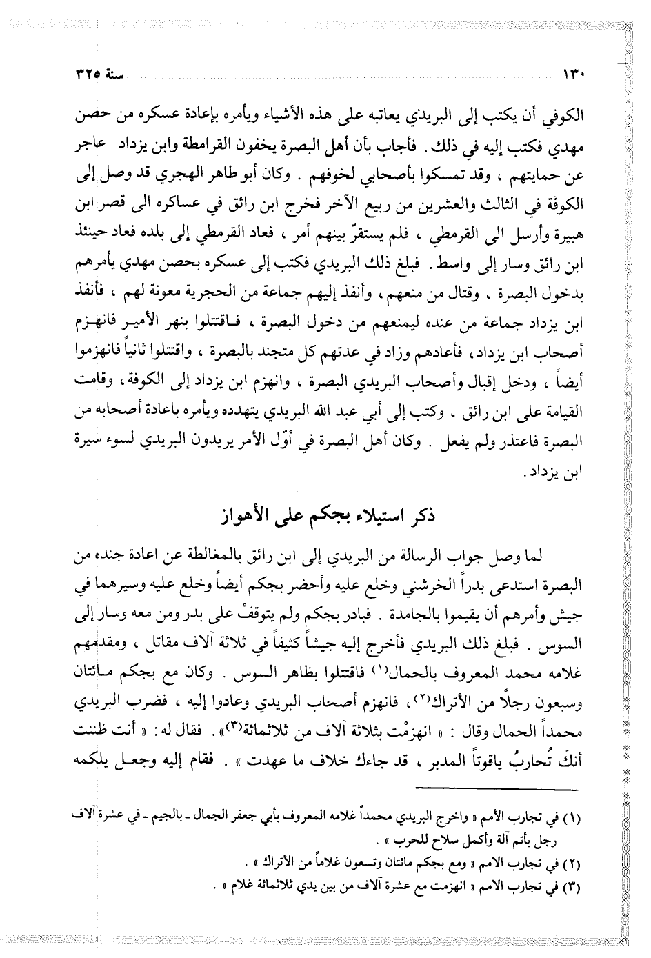 الكوفي أن يكتب إلى البريدي يعاتبه على الأشياء ويأمره بإعادة عسكره من حصن مهدي فكتب إليه في ذلك فأجاب بأن أهل البصرة يخفون القرامطة وابن يزداد عاجز عن حمايتهم وقد تمسكوا بأصحابي لخوفهم وكان أبو طاهر الهجري قد وصل إلى الكوفة في الثالث والعشربن من ربيع الآخر فخرج ابن رائق في عساكره إلى قصر ابن هبيرة وأرسل إلى القرمطي فلم يستقر بينهم أمر فعاد القرمطي إلى بلده فعاد حينئذ ابن رائق وسار إلى واسط فبلغ ذلك البريدي فكتب إلى عسكره بحصن مهدي يأمرهم بدخول البصرة وقتال من منعهم وأنفذ اليهم جماعة من الحجرية معونة لهم فأنفذ ابن يزداد جماعة من عنده ليمنعهم من دخول البصرة فاقتتلوا بنهر الأمير فانهزم أصحاب ابن يزداد فأعادهم وزاد في عدتهم كل متجند في البصرة واقتتلوا ثانيا فانهزموا أيضا ودخل إقبال وأصحاب البريدي البصرة وانهزم ابن يزداد إلى الكوفة وقامت القيامة على ابن رائق وكتب إلى أبي عبد الله البريدي يتهدده ويأمره باعادة أصحابه من البصرة فاعتذر ولم يفعل وكان أهل البصرة في أول الأمر يريدون البريدي لسوء سيرة ابن يزداد