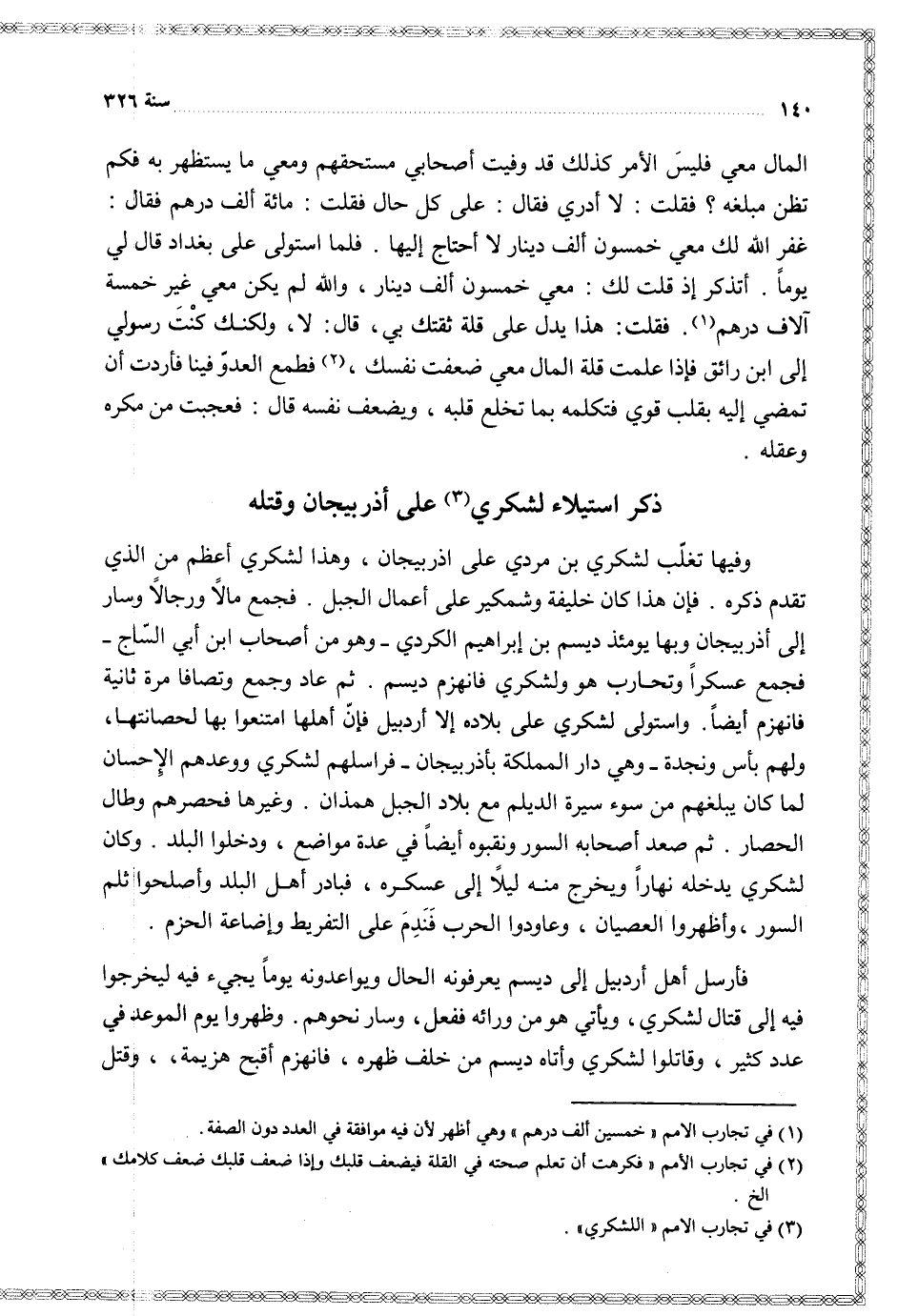 وفيها تغلب لشكري بن مردي علي اذربيجان وهذا لشكري أعظم من الذي تقدم ذكره فإن هذا كان خليفة وشمكير على أعمال الجبل فجمع مالا ورجالا وسار إلى أذربيجان وبها يومئذ ديسم بن إبراهيم الكردي وهو من أصحاب ابن أبي الساج فجمع عسكرا وتحارب هو ولشكري فانهزم ديسم ثم عاد وجمع وتصافا مرة ثانية فانهزم أيضا واستولى لشكري على بلاده إلا أردبيل فإن أهلها امتنعوا بها لحصانتها ولهم بأس ونجدة وهي دار دار المملكة بأدربيجان فراسلهم لشكري ووعدهم الإحسان لما كان يبلغهم من سوء سيرة الديلم مع بلاد الجبل همذان وغيرها فحصرهم وطال الحصار ثم صعد أصحابه السور ونقبوه أيضا في عدة مواضع ودخلوا البلد وكان لشكري يدخله نهارا ويخرج منه ليلا إلى عسكره فبادر أهل البلد وأصلحوا ثلم السور وأظهروا العصيان وعاودوا الحرب فندم على التفريط واضاعة الحزم