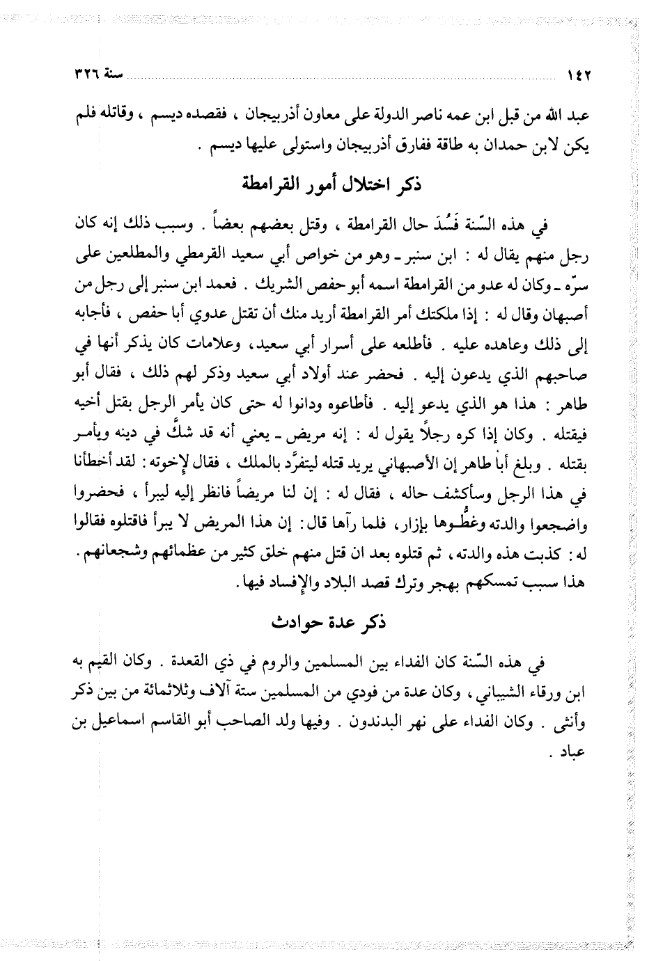 في هذه السنة فسد حال القرامطة وقتل بعضهم بعضا وسبب ذلك إنه كان رجل منهم يقال له ابن سنبر وهو من خواص أبي سعيد القرمطي والمطلعين على سره وكان له عدو من القرمطة اسمه أبو حفص الشريك فعمد ابن سنبر إلى رجل من أصبهان وقال له إذا ملكتك أمر القرامطة أريد منك أن تقتل عدوي أبا حفص فأجابه إلى ذلك وعاهده عليه فأطلعه على أسرار أبي سعيد وعلامات كان يذكر أنها في صاحبهم الذي يدعون إليه فحضر عند أولاد أبي سعيد وذكر لهم ذلك فقال أبو طاهر هذا هو الذي يدعو إليه فأطاعوه ودانوا له حتى كان يأمر الرجل بقتل أخيه فيقتله وكان إذا كره رجلا يقول له أنه مريض يعني أنه قد شك في دينه ويأمر بقتله وبلغ أبا طاهر إن الأصبهاني يريد قتله ليتفرد بالملك قال لإخوته لقد أخطانا في هذا الرجل وسأكشف حاله فقال له إن لنا مريضا فانظر إليه ليبأا فحضروا واضجعوا والدته وغطوها بازار فلما رآها قال إن هذا المريض لا يبرأ فاقتلوه فقالوا له كذبت هذه والدته ثم قتلوه بعد ان قتل منهم خلق كثير من عظمائهم وشجعانهم هذا سبب تمسكهم بهجر وترك قصد البلاد والإفساد فيها