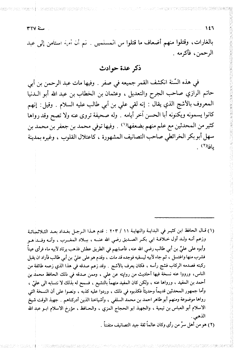 في هذه السنة انكشف القمر جميعه في صفر وفيها مات عبد الرحمن بن أبي حاتم الرازي صاحب الجرح والتعديل وعثمان بن الخطاب بن عبد الله أبو الدنيا المعروف بالأشج الذي يقال إنه لقي علي بن أبي طالب عليه السلام وقيل إنهم كانوا يسمونه ويكنونه أبا الحسن آخر أيامه وله صحيفة تروى عنه ولا تصح وقد رواها كثير من المحدثين مع علم منهم بضعفها وفيها توفي محمد بن جعفر بن محمد بن سهل أبو بكر الخرائطي صاحب التصانيف المشهورة كاعتلال القلوب وغيره بمدينة يافا