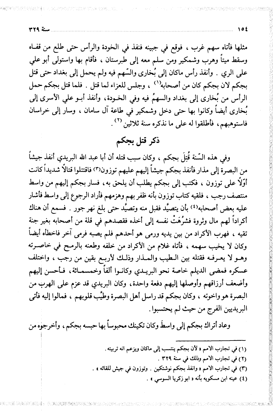وفي هذه السنة قتل بجكم وكان سبب قتله أن أبا عبد الله البريدي أنفذ جيشا من البصرة إلى مذار فأنفذ بجكم جيشا إليهم عليهم توزون فاقتتلوا قتالا شديدا كانت أولا على توزون فكتب إلى بجكم يطلب أن يلحق به فسار بجكم إليهم من واسط منتصف رجب فلقيه كتاب توزون بأنه ظفر بهم وهزمهم فأراد الرجوع إلى واسط فأشار عليه بعض أصحابه بان يتصيد فقبل منه وتصيد حتى بلغ نهر جور فسمع أن هناك أكرادا لهم مال وثروة فشرهت نفسه إلى أخذه فقصدهم في قلة من أصحابه بغير جنة تقيه فهرب الأكراد من بين يديه ورمى هو أحدهم فلم يصبه فرمى آخر فاخطاه أيضا وكان لا يخب سهمه فأتاه غلام من الأكراد من خلفه وطعنه بالرمح في خاصرته وهو لا يعرفه فقتله بين الطيب والمذار وذلك لأربع بقين من رجب واختلف عسكره فمضى الديلم خاصة نحو البريدي وكان ألفا وخمسمائة فأحسن إليهم وأضعف أرزاقهم وأوصلها إليهم دفعة واحدة وكان البريدي قد عزم على الهرب من البصرة هو واخوته وكان بجكم قد راسل أهل البصرة وطيب قلوبهم فمالوا إليه فأتى البريديين الفرج من حيث لم يحتسبوا