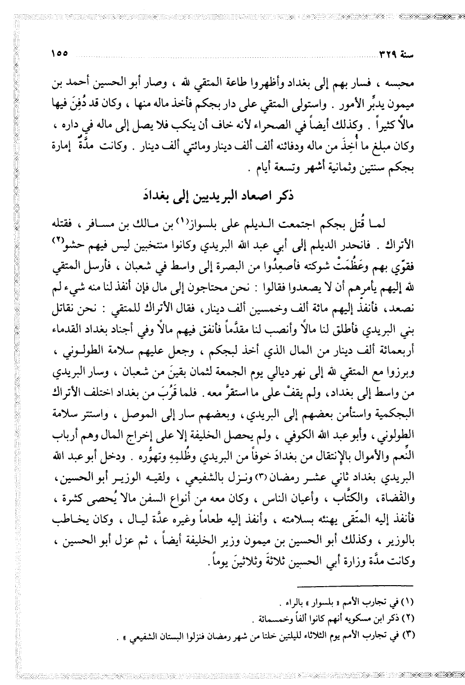 لما قتل بجكم اجتمعت الديلم على بلسواز بن مالك بن مسافر فقتله الأتراك فانحدر الديلم إلى أبي عبد الله البريدي وكانوا منتخبين ليس فيهم حشو فقوي بهم وعظمت شوكته فأصعدوا من البصرة إلى واسط في شعبان فأرسل المتقي لله إليهم يأمرهم أن لا يصعدوا فقالوا نحن محتاجون إلى مال فان أنفذ لنا منه شيء لم نصعد فأنفذ إليهم مائة ألف وخمسين ألف دينار فقال الأتراك للمتقي نحن نقاتل بني البريدي فأطلق لنا مالا وأنصب لنا مقدما فأنفق فيهم مالا وفي أجناد بغداد القدماء أربعمائة ألف دينار من المال الذي أخذ لبجكم وجعل عليهم سلامة الطولوني وبرزوا مع المتقي لله إلى نهر ديالي يوم الجمعة لثمان بقين من شعبان وسار البريدي من واسط إلى بغداد ولم يقف على ما استقر معه فلما قرب من بغداد اختلف الأتراك البجكمية واستأمن بعضهم إلى البريدي وبعضهم سار إلى الموصل واستتر سلامة الطولوني وأبو عبد الله الكوفي ولم يحصل الخليفة إلا على إخراج المال وهم أرباب النعم ولأاموال بالإنتقال من بغداد خوفا من البريدي وظلمه وتهوره ودخل أبو عبد الله البريدي بغداد ثاني عشر رمضان ونزل بالشفيعي ولقيه الوزير أبو الحسن والقضاة والكتاب وأعيان الناس وكان معه من أنواع السفن مالا يحصى كثيرة فأنفذ إليه المتقي يهننئه بسلامته وأنفذ إليه طعأما وغيره عدة ليال وكان يخاطب بالوزير وكذلك أبو الحسين بن ميمون وزير الخليفة أيضا ثم عزل أبو الحسين وكانت مدة وزارة أبي الحسين ثلاثة وثلاثين يوما