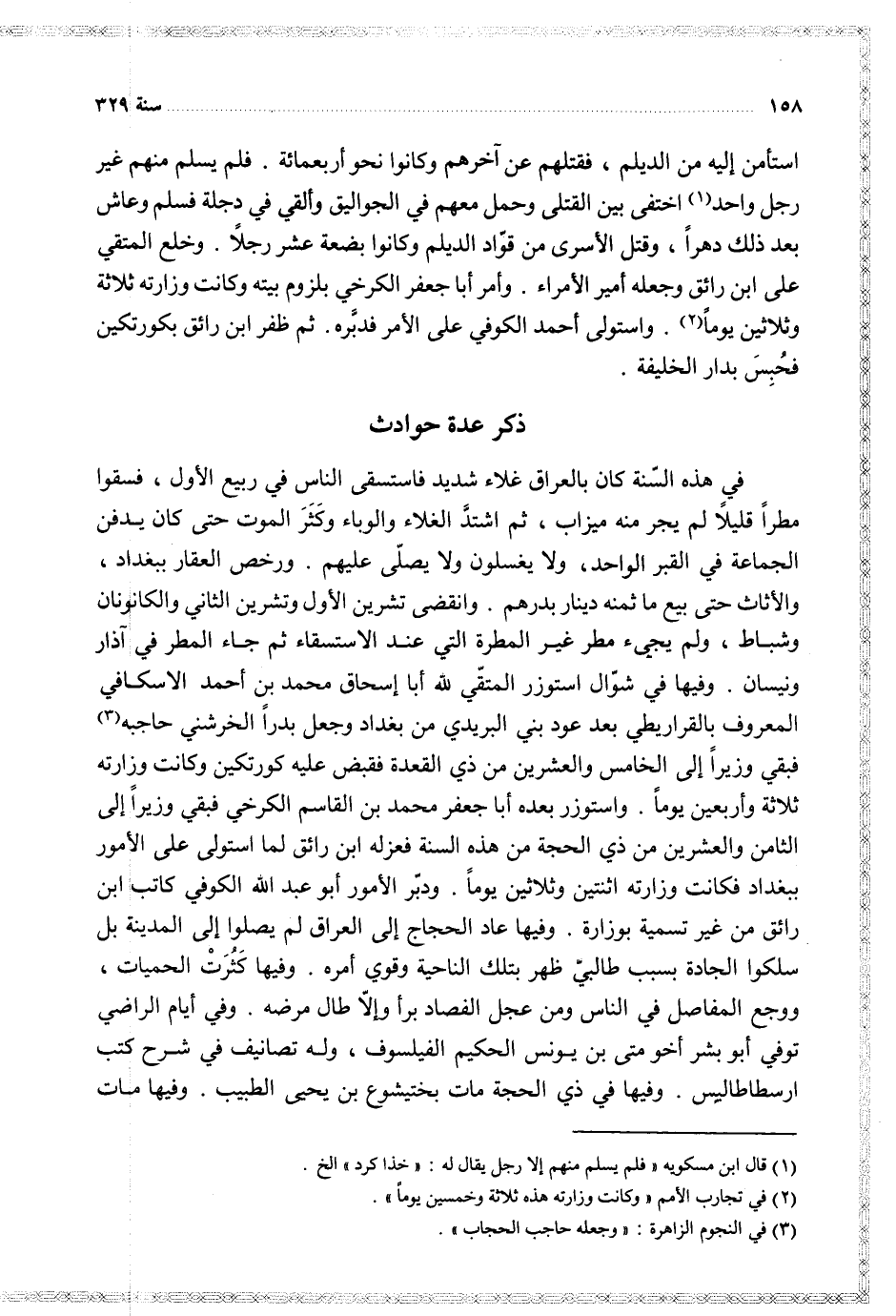 في السنة كان بالعراق غلاء شديد فاستسقى الناس في ربيع الأول فسقوا مطرا قليلا لم يجر منه ميزاب ثم اشتد الغلاء والوباء وكثر الموت حتى كان يدفن الجماعة في القبر الواحد ولا يغسلون ولا يصلى عليهم ورخص العقار ببغداد والأثاث حتى بيع ما ثمنه دينار بدرهم وانقضى تشرين الأول وتشرين الثاني والكانونان وشباط ولم يجيء مطر غير المطرة التي عند الاستسقاء ثم جاء المطر في آذار ونيسان وفيها في شوال استوزر المتقي لله أبا إسحاق محمد بن أحمد الاسكافي المعروف بالقراريطي بعد عود بني البريدي من بغداد وجعل بدرا الخرشني حاجبه فبقي وزيرا إلى الخامس والعشرين من ذي القعدة فقبض عليه كورتكين وزارته ثلاثة وأربعين يوما واستوزر بعده أبا جعفر محمد بن القاسم الكرخي فبقي وزيرا إلى الثامن والعشرين من ذي الحجة من هذه السنة فعزله ابن رائق لما استولى على الأمور ببغداد فكانت وزارته اثنتين وثلاثين يوما ودبر الأمور أبو عبد الله الكوفي كاتب ابن رائق من غير تسمية بوزارة وفيها عاد الحجاج إلى العراق لم يصلوا إلى المدينة بل سلكوا الجادة بسبب طالبي ظهر بتلك الناحية وقوي أمره وفيها كثرت الحميات ووجع المفاصل في الناس ومن عجل الفصاد برأ وإلا طال مرضه وفي أيام الراضي توفي أبو بشر أخو متى بن يونس الحكيم الفيلسوف وله تصانيف في شرح كتاب ارسطاطاليس وفيها في ذي الحجة مات بختيشوع ين يحيى الطبيب وفيها مات