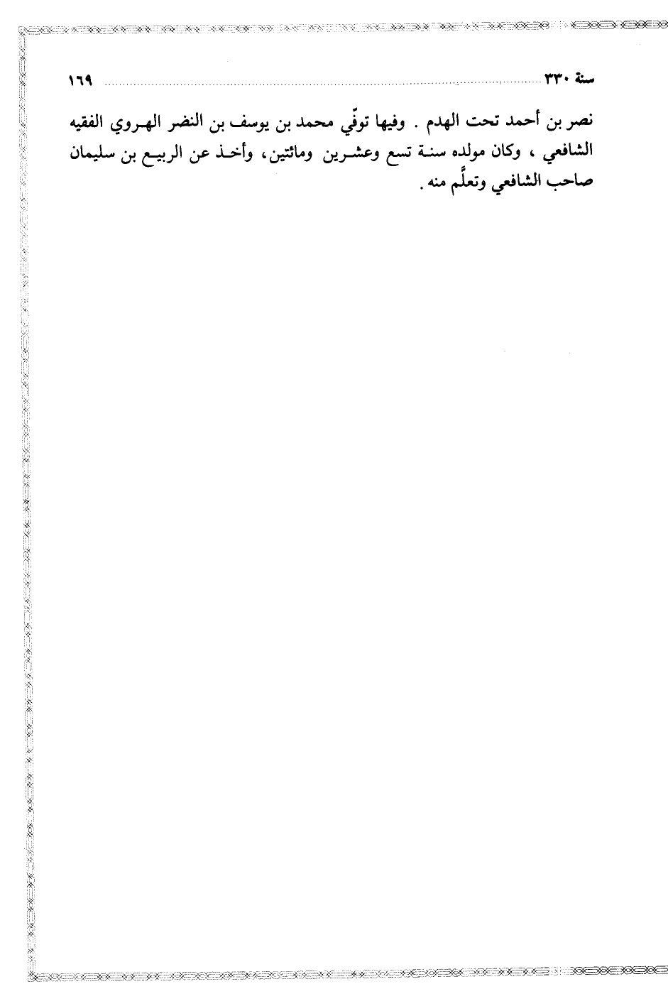 نصر بن أحمد تحت الهدم وفيها توفي محمد بن يوسف بن النضر الهروي الفقيه الشافعي وكان مولده سنة تسع وعشرين ومائتين وأخذ عن الربيع بن سليمان صاحب الشافعي وتعلم منه
