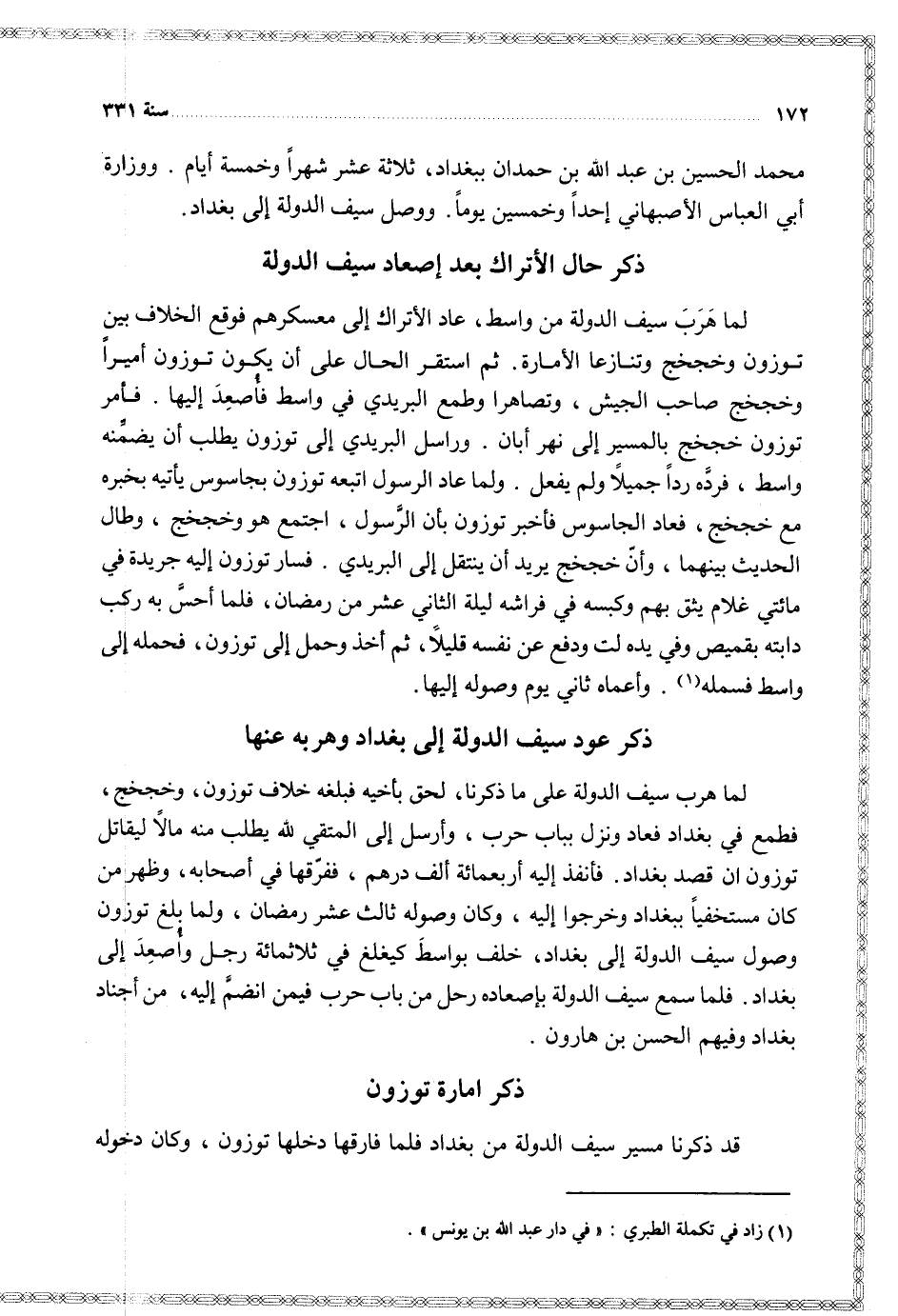 محمد الحسين بن عبد الله بن حمدان ببغداد ثلاثة عشر شهرا وخمسة أيام ووزارة أبي العباس الأصبهاني إحدا وخمسين يوما ووصل سيف الدولة إلى بغداد