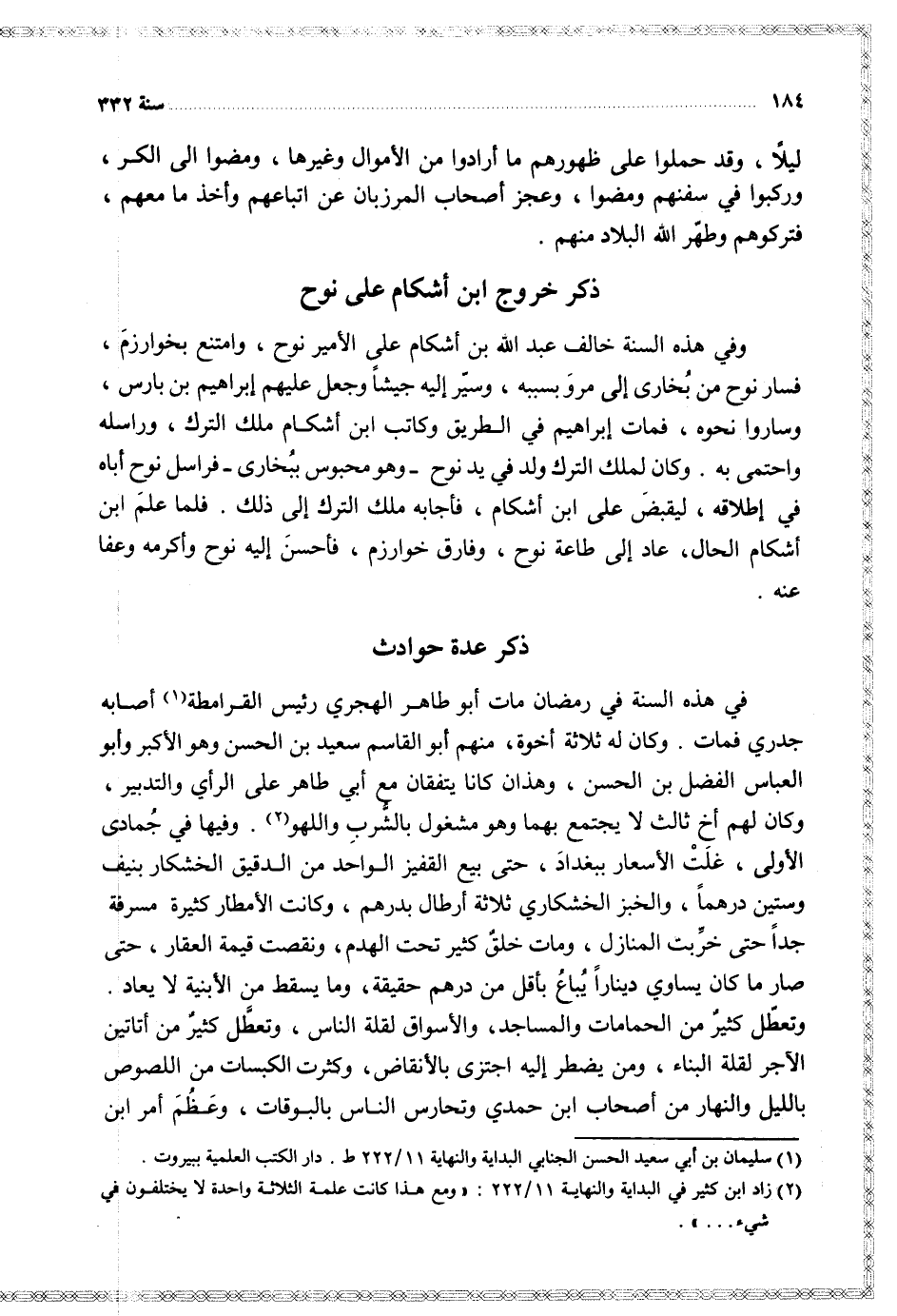 وفي هذه السنة خالف عبد الله بن أشكام على الأمير نوح وامتنع بخوارزم فسار نوح من بخاري إلى مرو بسببه وسير إليه جيشا وجعل إبراهيم بن بارس وساروا نحوه فمات إبراهيم في الطريق وكاتب ابن أشكام ملك الترك وراسله واحتمى به وكان لملك الترك ولد في يد نوح وهو محبوس ببخارى فراسل نوح أباه في إطلاقه ليقبض على ابن أشكام فأجابه ملك الترك إلى ذلك فلما علم ابن أشكام الحال عاد إلى طاعة نوح وفارق خوارزم فأحسن إليه نوح وأكرمه وعفا عنه