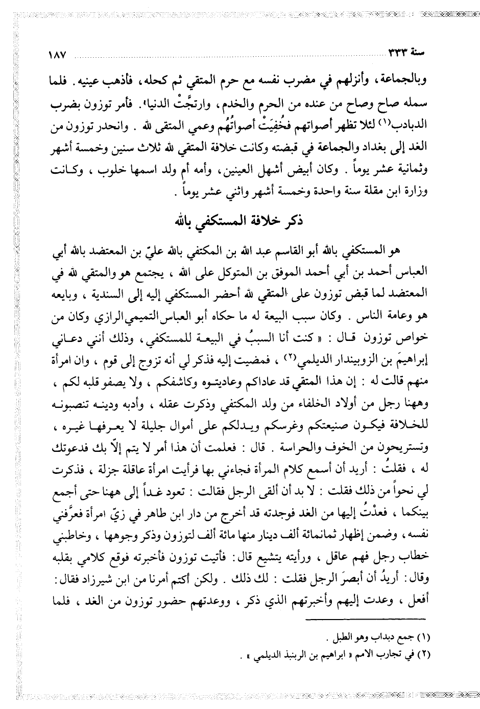 هو المستكفي بالله أبو القاسم عبد الله علي بن المكتفي بالله علي بن المعتضد بالله أبي العباس أحمد بن أبي أحمد الموفق بن المتوكل على الله يجتمع هو والمتقي لله في المعتضد لما قبض توزون على المتقي لله أحضر المستكفي إليه إلى السندية وبايعه هو وعامة الناس وكان سبب البيعة له ما حكاه أبو العباس التميمي الرازي وكان من خواص توزون قال كنت أنا السبب في البيعة للمستكفي وذلك أنني دعاني إبراهيم بن الزوبيندار الديلمي فمضيت إليه فذكر لي أنه تزوج إلى قوم وان أمراة منهم قالت له إن هذا المتقي قد عاداكم وعاديتوه وكاشفكم ولا يصفو قلبه لكم وههنا رجل من أولاد الخلفاء من ولد المكتفي وذكرت عقله وأدبه ودينه تنصبونه للخلافة فيكون صنيعتكم وغرسكم ويدلكم على أموال جليلة لا يعرفها غيره وتستريحون من الخوف والحراسة قال فعلمت أن هذا أمر لا يتم إلا بك فدعوتك له فقلت أريد أن أسمع كلام المرأة فجاءني بها فرأيت امرأة عاقلة جزلة فذكرت لي نحوا من ذلك فقلت لا بد أن ألقى الرجل فقالت تعود غدا إلى ههنا حتى أجمع بينكما فعدت إليها من الغد فوجدته قد أخرج من دار ابن طاهر في زي امرأة فعرفني نفسه وضمن إظهار ثمانمائة ألف دينار منها مائة ألف لتوزون وذكر وجوهها وخاطبني خطاب رجل فهم عاقل ورأيته يتشيع قال فأتيت توزون فأخبرته فوقع كلامي بقلبه وقال أريد أن أبصر الرجل فقلت لك ذلك ولكن أكتم أمرنا من ابن شيرزاد فقال أفعل وعدت إليهم وأخبرتهم الذي ذكر ووعدتهم حضور توزون من الغد فلما