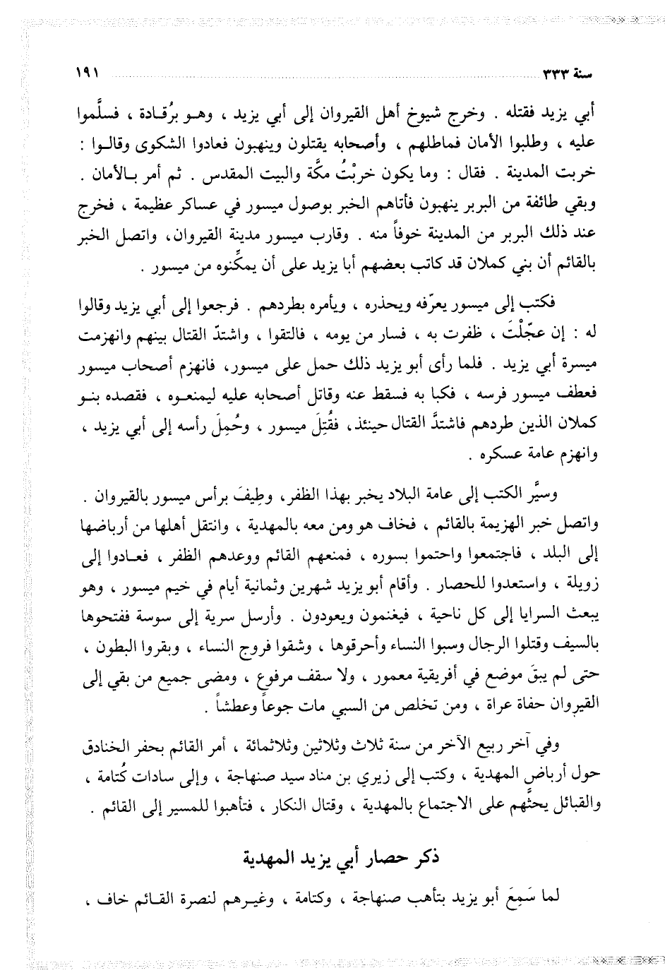 أبي يزيد فقتله وخرج شيوخ أهل القيروان إلى أبي يزيد وهو برقادة فسلموا عليه وطلبوا الأمان فماطلهم وأصحابه وينهبون فعادوا الشكوى وقالوا خربت المدينة فقال وما يكون خربت مكة والبيت المقدس ثم أمر بالأمان وبقي طائفة من البربر ينهبون فأتاهم الخبر بوصول ميسور في عساكر عظيمة فخرج عند ذلك البربر من المدينة خوفا منه وقارب ميسور مدينة القيروان واتصل الخبر بالقائم أن بني كملان قد كاتب بعضهم أبا يزيد على أن يمكنوه من ميسور