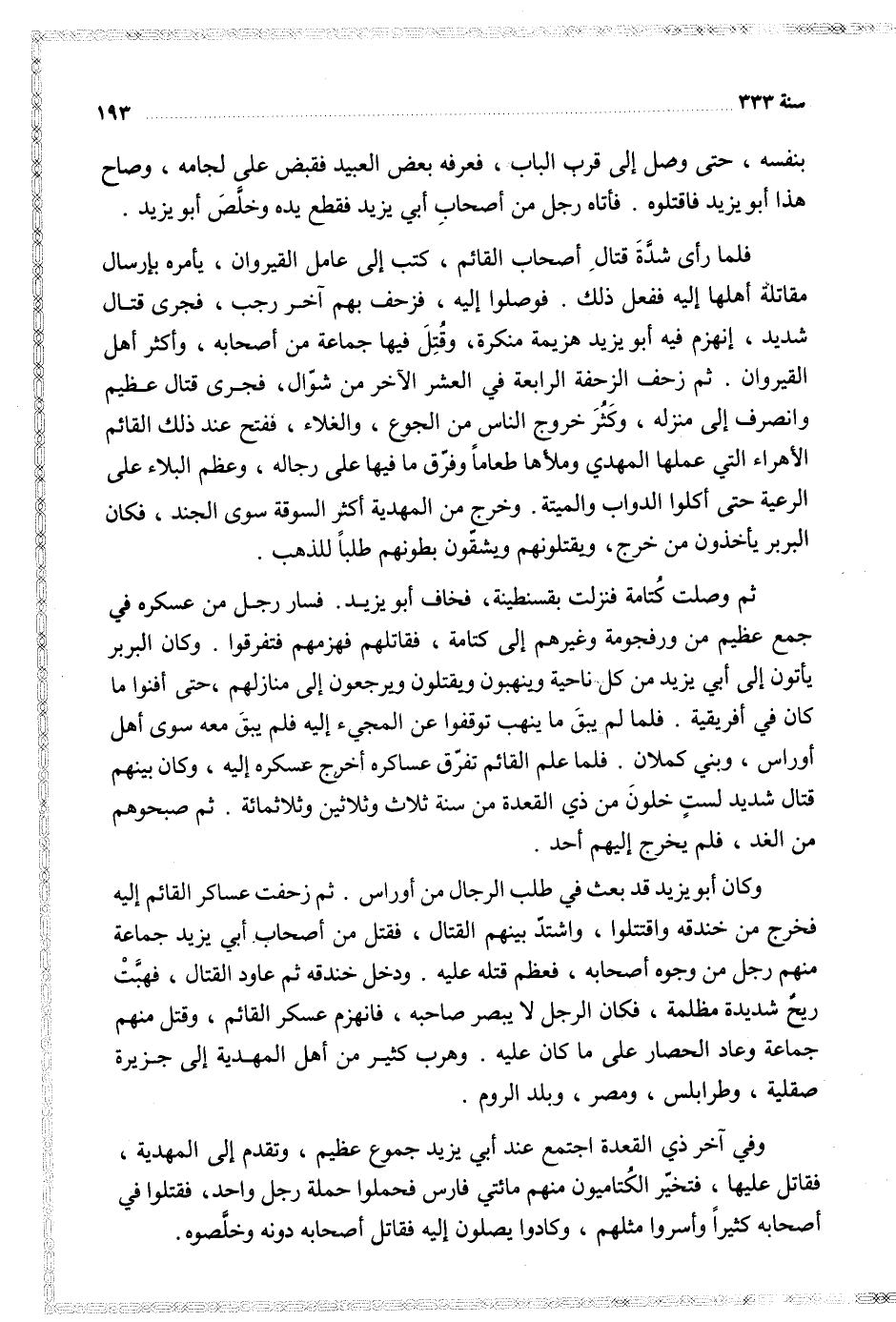 ثم وصلت كتامة فنزلت بقسنطينة فخاف أبو يزيد فسار رجل من عسكره في جمع عظيم من ورفجومة وغيرهم إلى كتامة فقاتلهم فهزمهم فترقوا وكان البربر يأتون إلى أبي يزيد من كل ناحية وينهبون ويقتلون ويرجعون إلى منازلهم حتى أفنوا ما كان في أفريقية فلما لم يبق ما نهب توقفوا عن المجيء إليه فلم يبق سوى أهل أوراس وبني كملان فلما علم القائم تفرق عساكره أخرج عسكره إليه وكان بينهم قتال شديد لست خلون من ذي القعدة من سنة ثلاث وثلاثين وثلاثمائة ثم صبحوهم من الغد فلم يخرج إليهم أحد