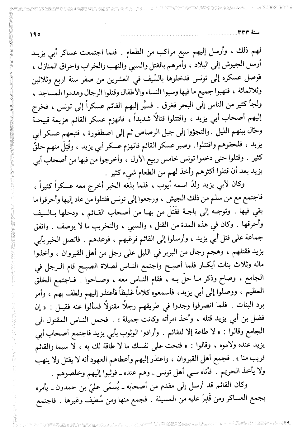 لهم ذلك وأرسل إليهم سبع مراكب من الطعام فلما اجتمعت عساكر أبي يزيد أرسل الجيوش إلى البلاد وأمرهم بالقتل والسبس والنهب والخراب واحراق المنازل فوصل عسكره إلى تونس فدخلوها بالسيف في العشرين من صفر سنة أربع وثلاثين وثلاثمائة فنهبوا جميع ما فيها وسبوا النساء والأطفال وقتلوا الرجال وهدموا المساجد ولجأ كثير من الناس إلى البحر فغرق فسير إليهم القائم عسكرا إلى تونس فخرج إليهم أصحاب أبي يزيد واقتتلوا قتالا شديدا فانهزم عسكر القائم هزيمة قبيحة وحال بينهم الليل والتجؤوا إلى جبل الرصاص ثم إلى اصطفورة فتبعهم عسكر أبي يزيد فلحقوهم واقتتلوا وصبر عسكر القائم فانهزم عسكر أبي يزيد وقتل منهم خلق كثير وقتلوا حتى دخلوا تونس خامس ربيع الأول وأخرجوا من فيها من أصحاب أبي يزيد بعد أن قتلوا أكثرهم وأخذ لهم من الطعام شيء كثير
