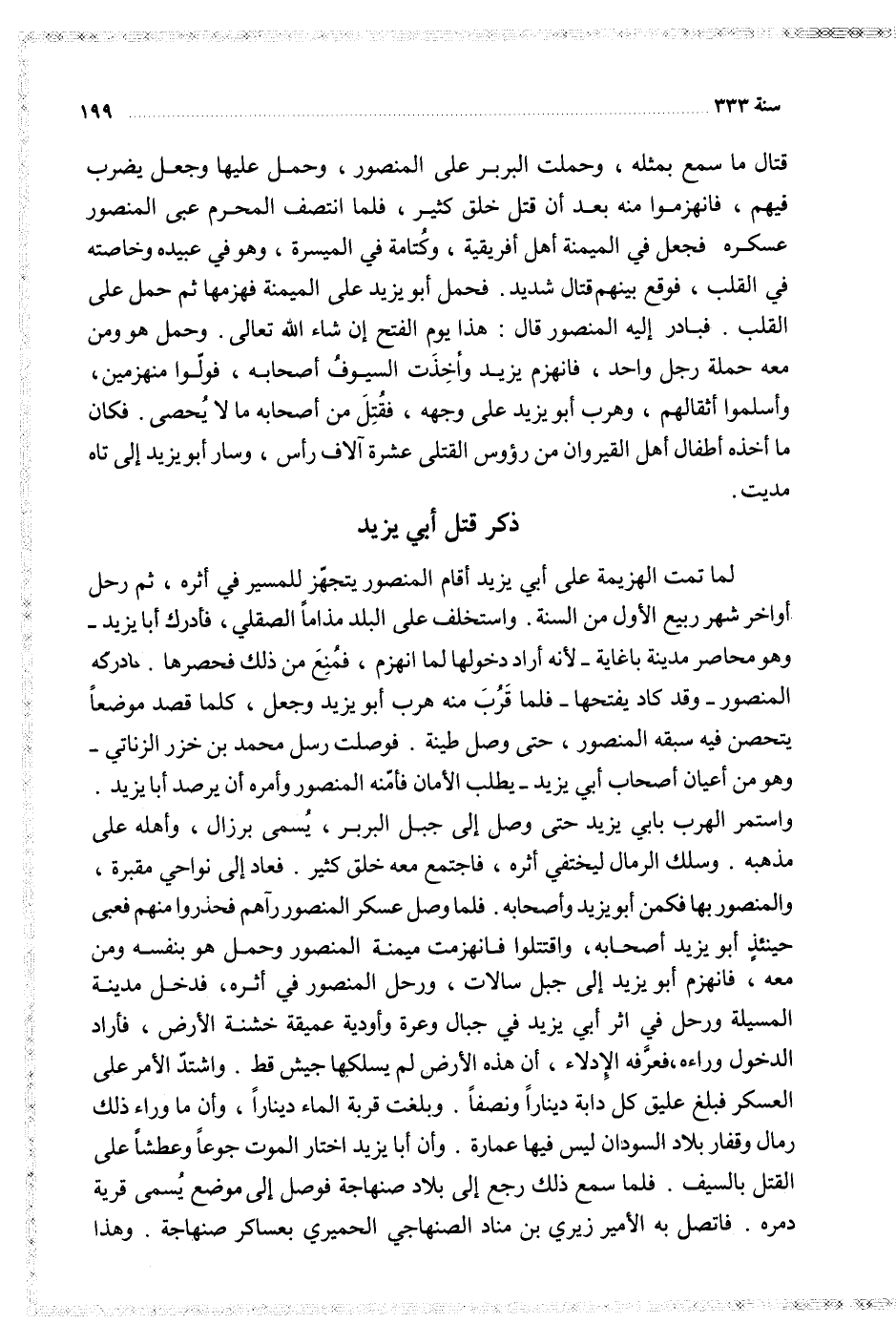 قتال ما سمع بمثله وحملت البربر على المنصور وحمل عليها وجعل يضرب فيهم فانهزموا منه بعد أن قتل خلق كثير فلما انتصف المحرم عبى المنصور عسكره فجعل في الميمنة أهل أفريقية وكتامة في الميسرة وهو في عبيده وخاصته في القلب فوقع بينهم قتال شديد فحمل أبو يزيد على الميمنة فهزمها ثم حمل على القلب فبادر إليه المنصور قال هذا يوم الفتح إن شاء الله تعالى وحمل هو ومن معه حملة رجل واحد فانهزم يزيد وأخذت السيوف أصحابه فولوا منهزمين وأسلموا أثقالهم وهرب أبو يزيد على وجهه فقتل من أصحابه ما لا يحصى فكان ما أخذه أطفال أهل القيروان من رؤوس القتلى عشرة آلاف رأس وسار أبو يزيد إلى تاه مديت