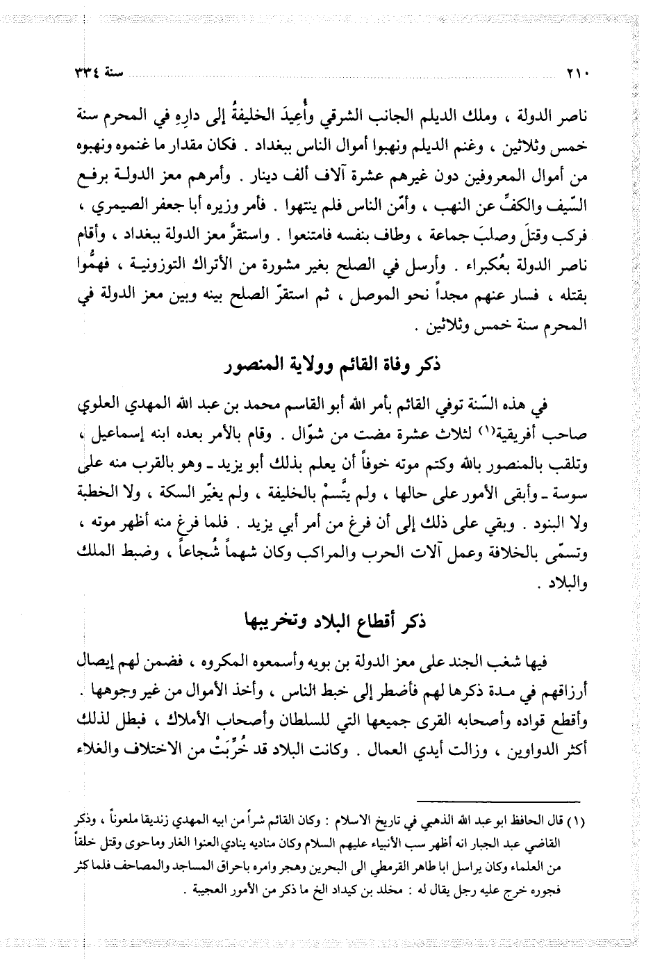 في هذه السنة توفي القائم بأمر الله أبو القاسم محمد بن عبد الله المهدي العلوي صاحب أفريقية لثلاث عشرة مضت من شوال وقام بالأمر بعده ابنه إسماعيل وتلقب بالمنصور بالله وكتم موته خوفا أن يعلم بذلك أبو يزيد وهو بالقرب منه على سوسة وأبقى الأمور على حالها ولم يتسم بالخليفة ولم يغير السكة ولا الخطبة ولا البنود وبقي على ذلك إلى أن فرغ من أمر أبي يزيد فلما فرغ منه أظهر موته وتسمى بالخلافة وعمل آلات الحرب والمراكب وكان شهما شجاعا وضبط الملك والبلاد