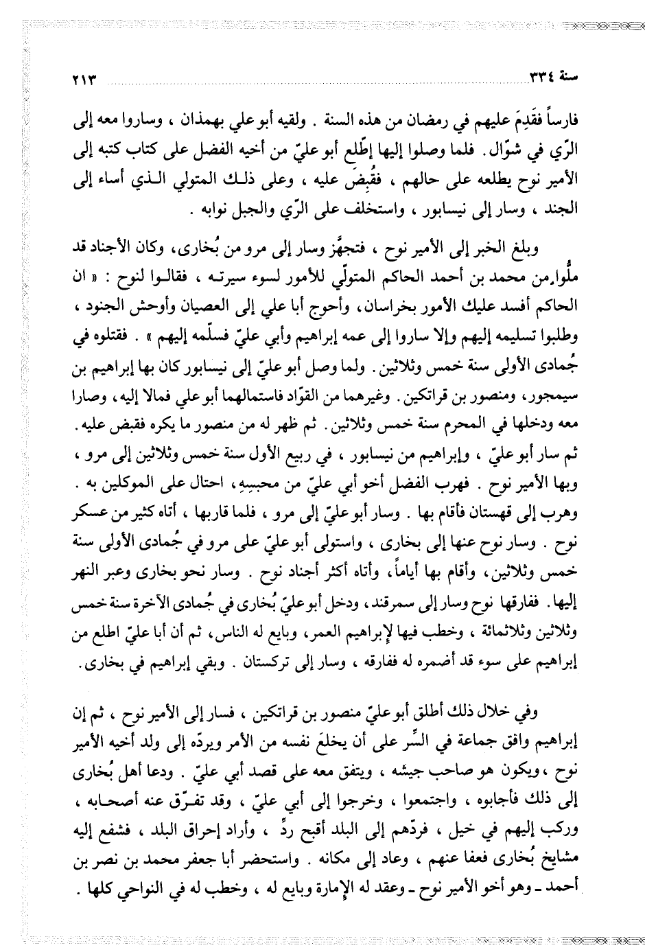 فارسا فقدم عليهم في رمضان من هذه السنة ولقيه أبو علي بهمذان وسار معه إلى الري في شوال فلما وصلوا إليها إطلع أبو علي من أخيه الفضل على كتاب كتبه إلى الأمير نوح يطلعه على حالهم فقبض عليه وعلى ذلك المتولي الذي أساء إلى الجند وسار إلى نيسابور واستخلف على الري والجبل نوابه