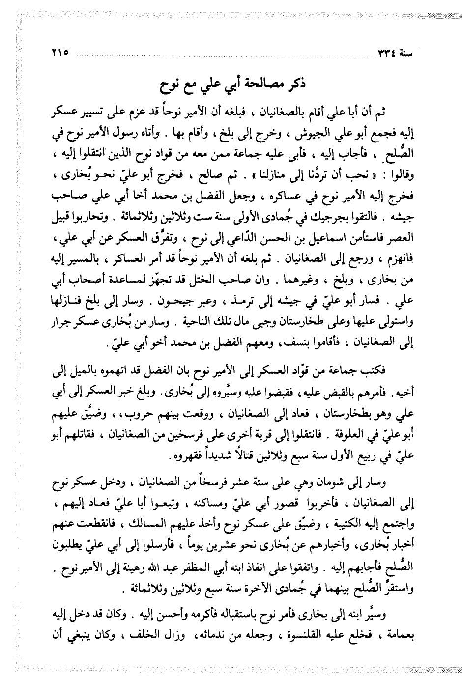 وسار إلى شومان وهي على ستة عشر فرسخا من الصغانيان ودخل عسكر نوح إلى الصغانيان فأخربوا قصور أبي علي ومساكنه وتبعوا أبا علي فعاد إليهم واجتمع إليه الكتيبة وضيق على عسكر نوح وأخذ عليهم المسالك فانقطعت عنهم أخبار بخارى وأخبارهم عن بخارى نحو عشرين يوما فأرسلوا إلى أبي علي يطلبون الصلح فأجابهم إليه واتفقوا على انفاذ ابنه أبي المظفر عبد الله رهينة إلى الأمير نوح واستقر الصلح بينهما في جمادى الآخرة سنة سبع وثلاثين وثلاثمائة