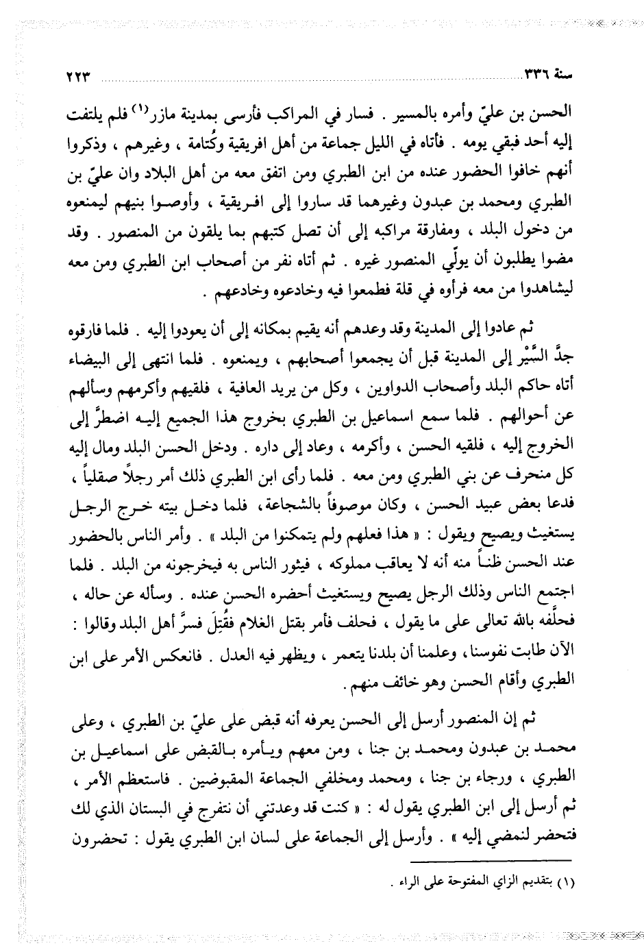ثم أن المنصور أرسل إلى الحسن يعرفه أنه قبض على علي بن الطبري وعلى محمد بن عبدون ومحمد بن جنا ومن معهم ويأمره بالقبض على اسماعيل بن الطبري ورجاء بن جنا ومحمد ومخلفي الجماعة المقبوضين فاستعظم الأمر ثم أرسل إلى ابن الطبري ويقول له كنت قد وعدتني أن نتفرج في البستان الذي لك فتحضر لنمضي إليه وأرسل إلى الجماعة على لسان ابن الطبري يقول تحضرون