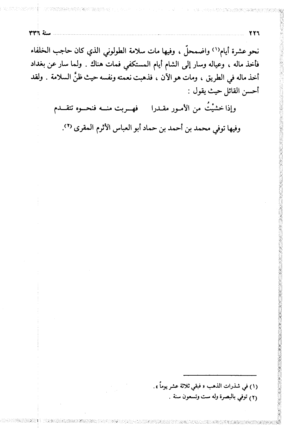 ( وإذا خشيت من الأمور مقدرا ... فهربت منه فنحوه تتقدم ) وفيها توفي محمد بن أحمد بن حماد أبو العباس الأثرم المقرى
