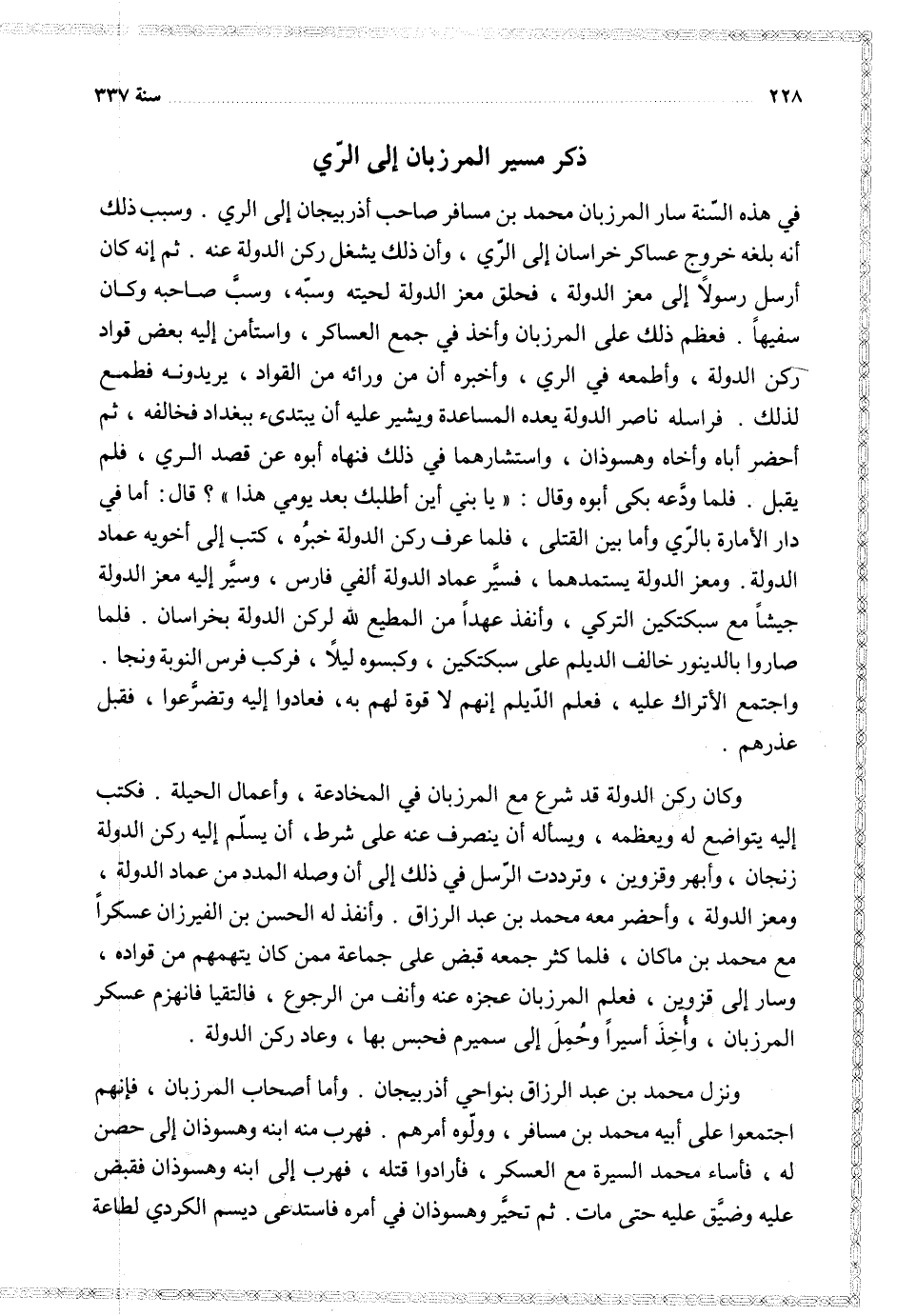 في هذه السنة سار المرزبان محمد بن مسافر صاحب أذربيجان إلى الري وسبب ذلك أنه بلغه خروج عساكر خراسان إلى الري وان ذلك يشغل ركن الدولة عنه ثم أنه كان أرسل رسولا إلى معز الدولة فحلق معز الدولة لحيته وسبه وسب صاحبه وكان سفيها فعظم ذلك على المرزبان وأخذ في جمع العساكر واستأمن إليه بعض قواد ركن الدولة وأطعمه في الري وأخبره أن من ورائه من القواد يريدونه فطمع لذلك فراسله ناصر الدولة يعده المساعدة ويشير عليه أن يبتدئ ببغداد فخالفه ثم أحضرا أباه وأخاه وهسوذان واستشارهما في ذلك فنهاه أبوه عن قصد الري فلم يقبل فلما ودعه بكى أبوه وقال يا بني أين أطلبك بعد يومي هذا قال أما في دار الأمارة بالري وأما بين القتلى فلما عرف ركن الدولة خبره كتب إلى أخويه عماد الدولة ومعز الدولة يستمدهما فسير عماد الدولة ألفي فارس وسير إليه معز الدولة جيشا مع سبكتكين التركي وأنفذ عهدا من المطيع لله لركن الدولة بخراسان فلما صاروا بالدينور خالف الديلم على سبكتكين وكبسوه ليلا فركب فرس النوبة ونجا واجتمع الأتراك عليه فعلم الديلم إنهم لا قوة لهم به فعادوا إليه وتضرعوا فقبل عذرهم