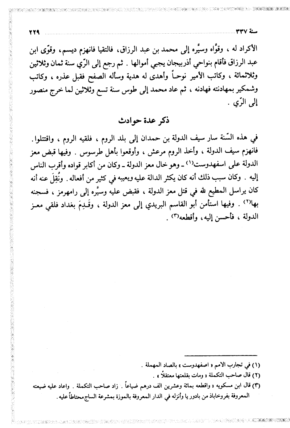 في هذه السنة سار سيف الدولة بن حمدان إلى بلد الروم فلقيه الروم واقتتلوا فانهزم سيف الدولة وأخذ الروم مرعش وأوقعوا بأهل طرسوس وفيها قبض معز الدولة على اسفهدوست وهو خال معز الدولة وكان من أكابر قواده وأقرب الناس إليه وكان سبب ذلك أنه كان يكثر الدالة عليه ويعيبه في كثير من أفعاله ونقل عنه أنه كان يراسل المطيع لله في قتل معز الدولة فقبض عليه وسيره إلى رامهرمز فسجنه بها وفيها استأمن أبو القاسم البريدي إلى معز الدولة وقدم بغداد فلقي معز الدولة فأحسن إليه وأقطعه