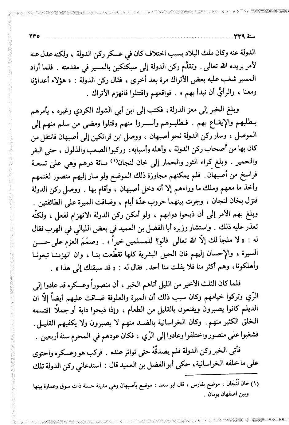 وبلغ الخبر إلى معز الدولة فكتب إلى ابن أبي الشوك الكردي وغيره يأمرهم بطلبهم والإيقاع بهم فطلبوهم وأسروا منهم وقتلوا ومضى من سلم منهم إلى الموصل وسار ركن الدولة نحو أصبهان ووصل ابن قراتكين إلى أصبهان فانتقل من كان بها من أصحاب ركن الدولة وأهله وأسبابه وركبوا الصعب والذلول حتى البقر والحمير وبلغ كراء الثور والحمار إلى خان لنجان مائة درهم وهي على تسعة فراسخ من أصبهان فلم يمكنهم مجاوزة ذلك الموضع ولو سار إليهم منصور لغنمهم وأخذ ما معهم وملك ما وراءهم إلا أنه دخل أصبهان وأقام بها ووصل ركن الدولة فنزل بخان لنجان وجرت بينهما حروب عدة أيام وضاقت الميرة على الطائفتين وبلغ بهم الأمر إلى أن ذبحوا دوابهم ولو أمكن ركن الدولة الانهزام لفعل ولكنه تعذر عليه ذلك واستشار وزيره أبا الفضل بن العميد في بعض الليالي في الهرب فقال له لا ملجأ لك إلا الله تعالى فانو للمسلمين خيرا وصمم العزم على حسن السيرة والإحسان إليهم فان الحيل البشرية كلها تقطعت بنا وان انهزمنا تبعونا وأهلكونا وهم أكثر منا فلا يفلت منا أحد فقال له قد سبقتك إلى هذا