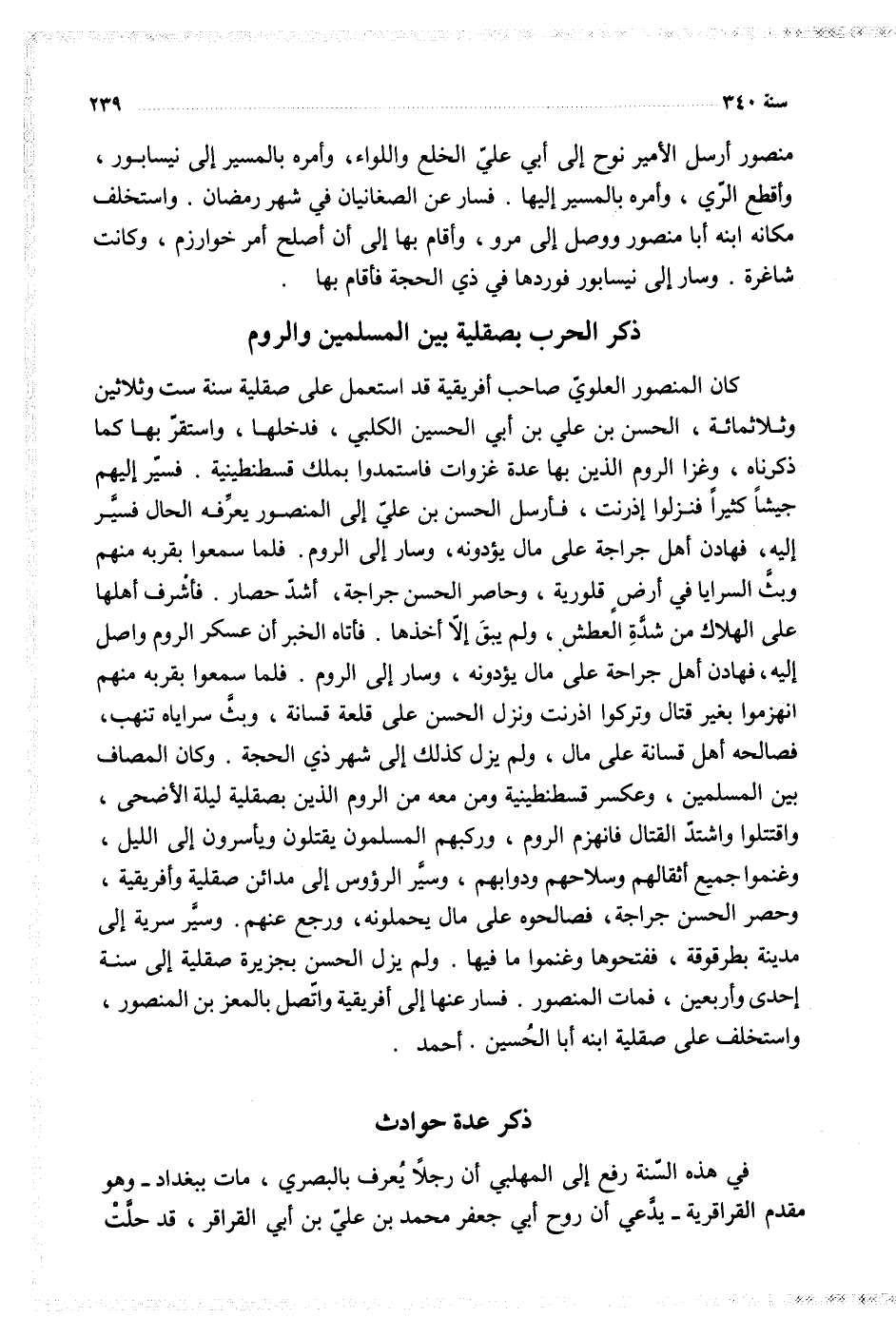 كان المنصور العلوي صاحب أفريقية قد استعمل على صقلية سنة ست وثلاثين وثلاثمائة الحسن بن علي بن أبي الحسين الكلبي فدخلها واستقر بها كما ذكرناه وغزا الروم الذين بها عدة غزوات فاستمدوا بملك القسطنطينية فسير إليهم جيشا كثيرا فنزلوا إذرنت فأرسل الحسن بن علي إلى المنصور يعرفه الحال فسير إليه فهادن أهل جراجة على مال يؤدونه وسار إلى الروم فلما سمعوا بقربه منهم وبث السرايا في أرض قلورية وحاصر الحسن جراجة أشد حصار فأشرف أهلها على الهلاك من شدة العطش ولم يبق إلا أخذها فأتاه الخبر أن عسكر الروم واصل إليه فهادن أهل جراجة على مال يؤدونه وسار إلى الروم فلما سمعوا بقربه منهم أنهزموا بغير قتال وتركوا اذرنت ونزل الحسن على قلعة قسانة وبث سراياه تنهب فصالحه أهل قسانة على مال ولم يزل كذلك إلى شهر ذي الحجة وكان المصاف بين المسلمين وعسكر قسطنطينية ومن معه من الروم الذين بصقلية ليلة الأضحى واقتتلوا واشتد القتال فأنهزم الروم وركبهم المسلمون يقتلون ويأسرون إلى الليل وغنموا جميع أثقالهم وسلاحهم ودوابهم وسير الرؤوس إلى مدائن صقلية وأفريقية وحصر الحسن جراجة فصالحوه على مال يحملونه ورجع عنهم وسير سرية إلى مدينة بطرقوقة ففتحوها وغنموا ما فيها ولم يزل الحسن بجزيرة صقلية إلى سنة إحدى وأربعين فمات المنصور فسار عنها إلى أفريقية واتصل بالمعز بن المنصور واستخلف على صقلية ابنه أبا الحسين أحمد