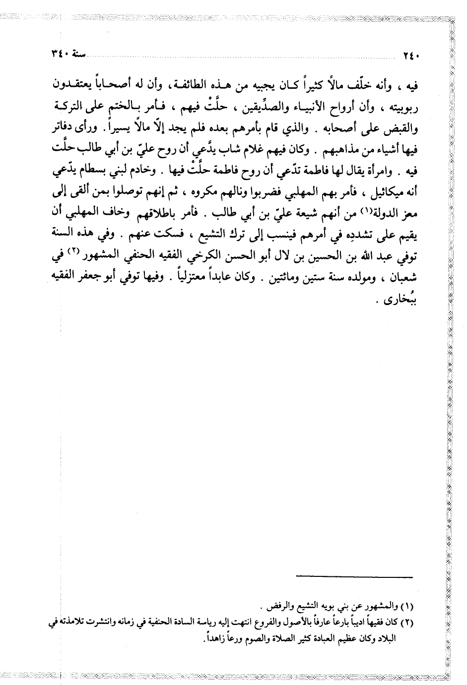 فيه وأنه خلف مالا كثيرا كان يجيبه من هذه الطائفة وأن له أصحابا يعتقدون ربوبيته وأن أرواح الأنبياء والصديقين حلت فيهم فأمر بالختم على التركة والقبض على أصحابه والذي قام بأمرهم بعده فلم يجد إلا مالا يسيرا ورأى دفاتر فيها أشياء من مذاهبهم وكان فيهم غلام شاب يدعي أن روح علي بن أبي طالب حلت فيه وامرأة يقال لها فاطمة تدعي أن روح فاطمة حلت فيها وخادم لبني بسطام يدعي أنه ميكائيل فأمرهم بهم المهلبي فضربوا ونالهم مكروه ثم إنهم توصلوا بمن ألقى إلى معز الدولة من أنهم شيعة علي بن أبي طالب فأمر باطلاقهم وخاف المهلبي أن يقيم على تشدده في أمرهم فينسب إلى ترك التشيع فسكت عنهم وفي هذه السنة توفي عبد الله بن الحسين بن لال أبو الحسن الكرخي الفقيه الحنفي المشهور في شعبان ومولده سنة ستين ومائتين وكان عابدا معتزليا وفيها توفي أبو جعفر الفقيه ببخارى