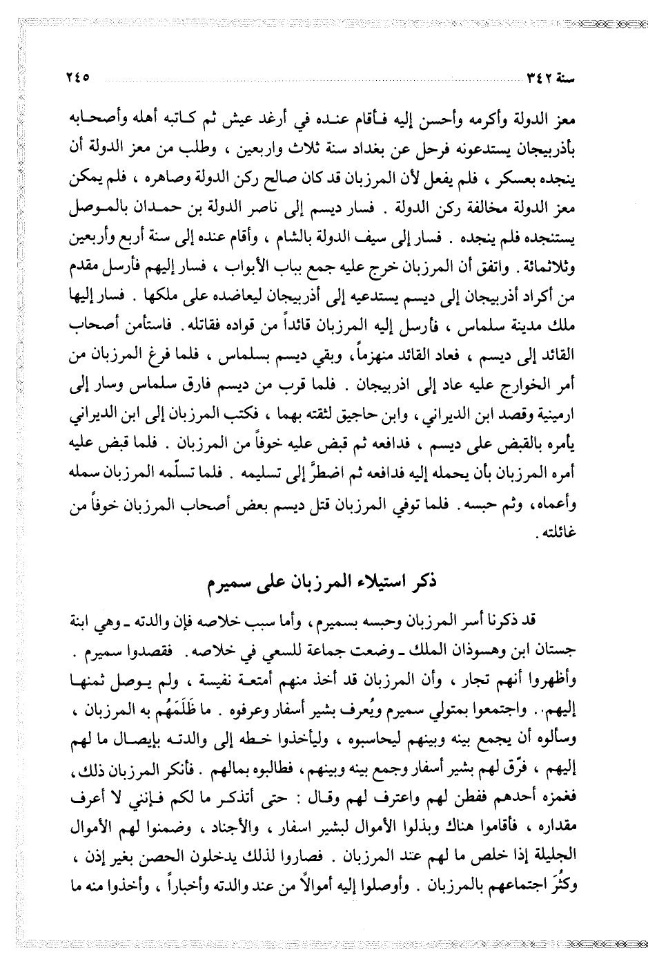 قد ذكرنا أسر المرزبان وحبسه بسميرم وأما سبب خلاصه فإن والدته وهي ابنة جستان ابن وهسوذان الملك وضعت جماعة للسعي في خلاصه فقصدوا سميرم وأظهروا أنهم تجار وأن المرزبان قد أخذ منهم أمتعة نفيسة ولم يوصل ثمنها إليهم واجتمعوا بمتولي سميرم ويعرف بشير أسفار وعرفوه ما ظلهم به المرزبان وسألوه أن يجمع بينه وبينهم ليحاسبوه وليأخذوا خطه إلى والدته بايصال ما لهم إليهم فرق لهم بشير أسفار وجمع بينه وبينهم فطالبوه بمالهم فأنكر المرزبان ذلك فغمزه أحدهم ففطن لهم واعترف لهم وقال حتى أتذكر ما لكم فإنني لا أعرف مقداره فأقاموا هناك وبذلوا الأموال لبشير اسفار والأجناد وضمنوا لهم الأموال الجليلة إذا خلص ما لهم عند المرزبان فصاروا لذلك يدخلون الحصن بغير إذن وكثر اجتماعهم بالمرزبان وأوصلوا إليه أموالا من عند والدته وأخبارا وأخذوا منه ما