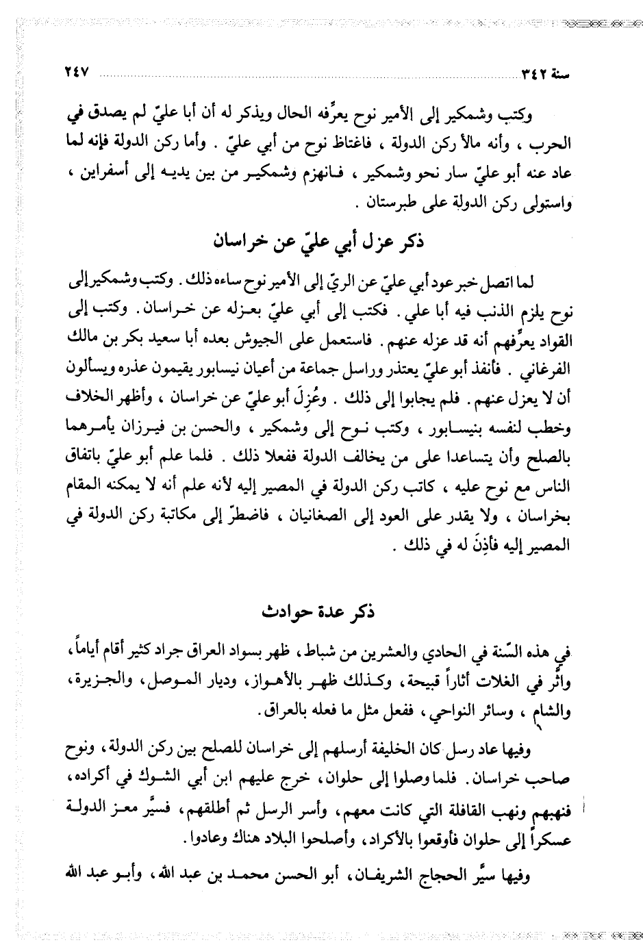 وفيها عاد رسل كان الخليفة أرسلهم إلى خراسان للصلح بين ركن الدولة ونوح صاحب خراسان فلما وصلوا إلى حلوان خرج عليهم ابن أبي الشوك في أكراده فنهبهم ونهب القافلة التي كانت معهم وأسر الرسل ثم أطلقهم فسير معز الدولة عسكرا إلى حلوان فأوقعوا بالأكراد وأصلحوا البلاد هناك وعادوا