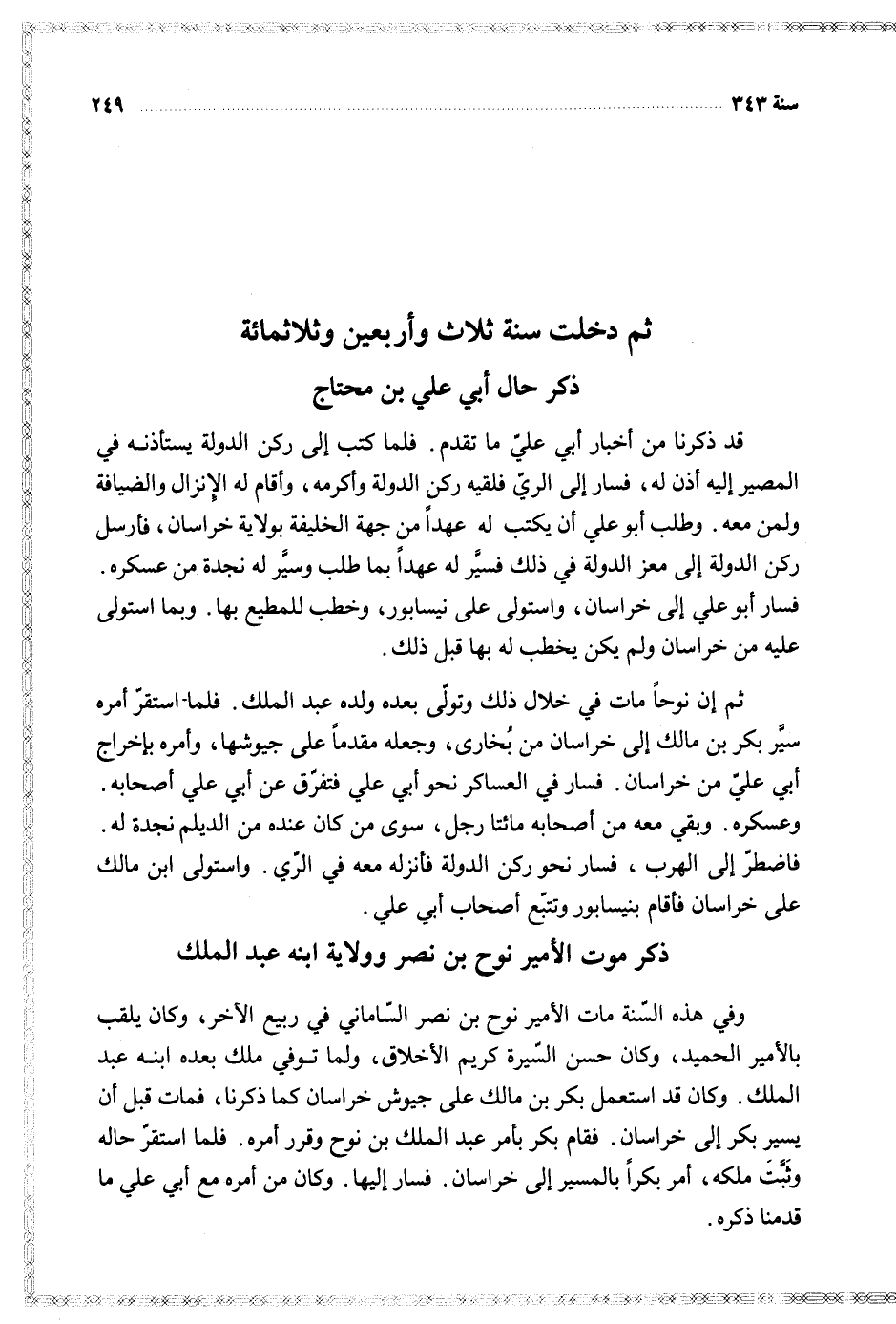 وفي هذه السنة مات الأمير نوح بن نصر الساماني في ربيع الآخر وكان يلقب بالأمير الحميد وكان حسن السيرة كريم الأخلاق ولما توفي ملك بعده ابنه عبد الملك وكان قد استعمل بكر بن مالك على جيوش خراسان كما ذكرنا فمات قبل أن يسير بكر إلى خراسان فقام بكر بأمر عبد الملك بن نوح وقرر أمره فلما استقر حاله وثبت ملكه أمر بكرا بالمسير إلى خراسان فسار إليها وكان من أمره مع أبي علي ما قدمنا ذكره