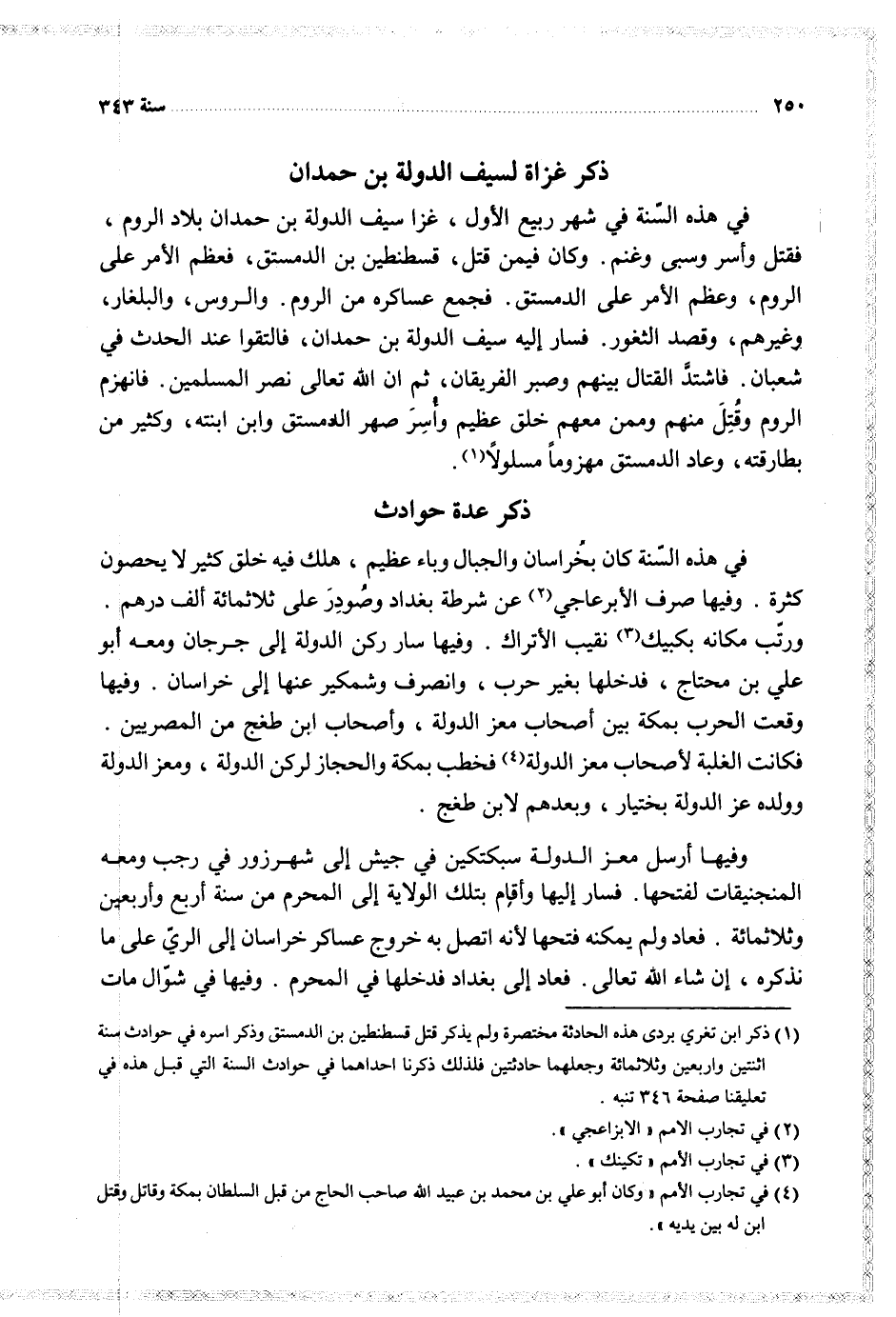 في هذه السنة في شهر ربيع الأول غزا سيف الدولة بن حمدان بلاد الروم فقتل وأسر وسبى وغنم وكان فيمن قتل قسطنطين بن الدمستق فعظم الأمر على الروم وعظم الأمر على الدمستق فجمع عساكره من الروم والروس والبلغار وغيرهم وقصد الثغور فسار إليه سيف الدولة بن حمدان فالتقوا عند الحدث في شعبان فاشتد القتال بينهم وصبر الفريقان ثم ان الله تعإلى نصر المسلمين فانهزم الروم وقتل منهم وممن معهم خلق عظيم وأسر صهر الدمستق وابن ابنته وكثير من بطارقته وعاد الدمستق مهزوما مسلولا