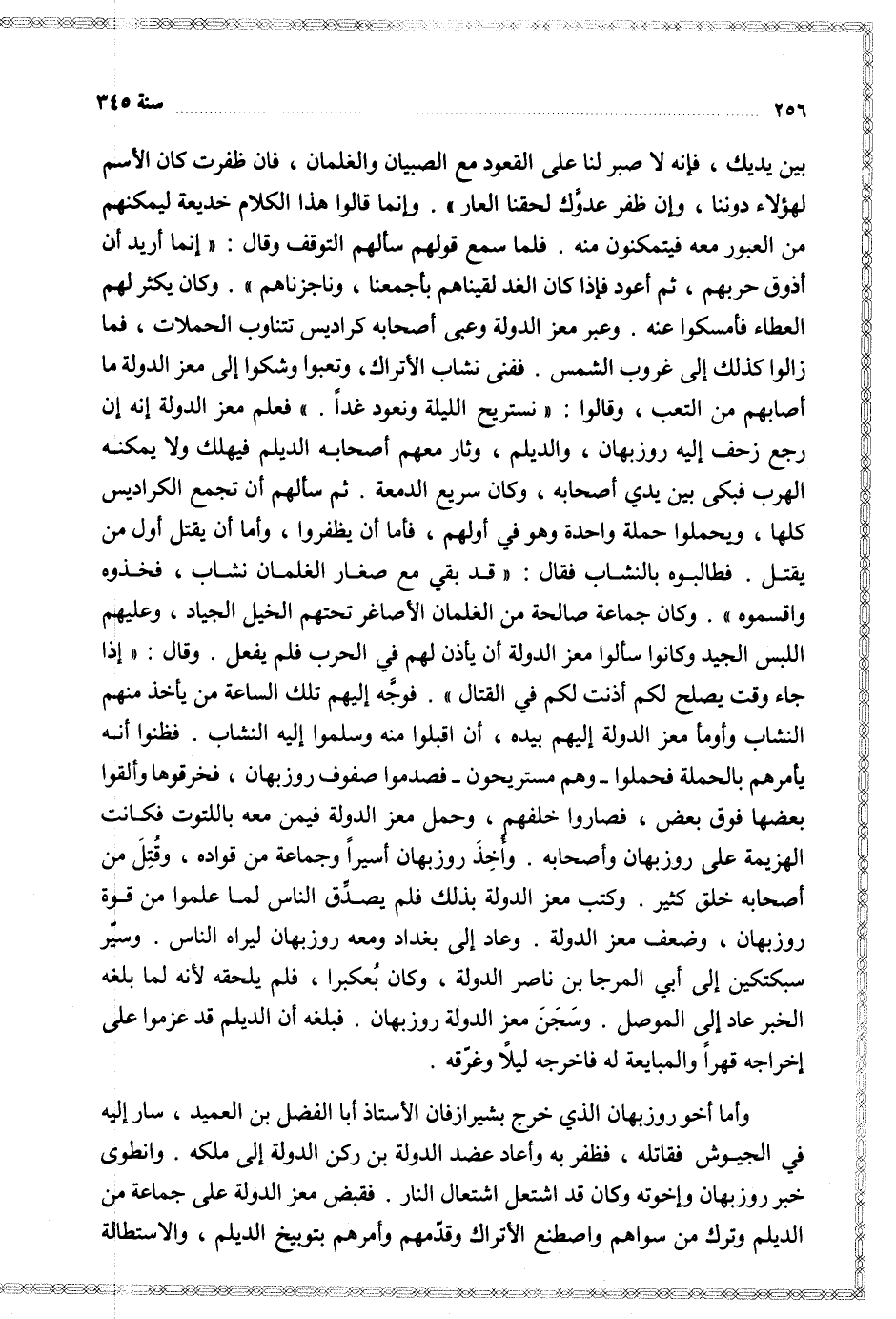 بين يديك فإنه لا صبر لنا على القعود مع الصبيان والغلمان فان ظفرت كان الاسم لهؤلاء دوننا وأن ظفر عدوك لحقنا العار وإنما قالوا هذا الكلام خديعة ليمكنهم من العبور معه فيتمكنون منه فلما سمع قولهم سألهم التوقف وقال إنما أريد أن اذوق حربهم ثم أعود فإذا كان الغد لقيناهم بأجمعنا وناجزناهم وكان يكثر لهم العطاء فأمسكوا عنه وعبر معز الدولة وعبى أصحابه كراديس تتناوب الحملات فما زالوا كذلك إلى غروب الشمس ففنى نشاب الأتراك وتعبوا وشكوا إلى معز الدولة ما أصابهم من التعب وقالوا نستريح الليلة ونعود غدا فعلم معز الدولة إنه إن رجع زحف اليه روزبهان والديلم وثار معهم أصحابه الديلم فيهلك ولا يمكنه الهرب فبكى بين يدي أصحابه وكان سريع الدمعة ثم سألهم أن تجمع الكراديس كلها ويحملوا حملة واحدة وهو في أولهم فأما أن يظفروا وأما أن يقتل أول من يقتل فطالبوه بالنشاب فقال قد بقي مع صغار الغلمان نشاب فخذوه واقسموه وكان جماعة صالحة من الغلمان الأصاغر تحتهم الخيل الجياد وعليهم اللبس الجيد وكانوا سألوا معز الدولة أن يأذن لهم في الحرب فلم يفعل وقال إذا جاء وقت يصلح لكم أذنت لكم في القتال فوجه إليهم تلك الساعة من يأخذ منهم النشاب واومأ معز الدولة إليهم بيده أن اقبلوا منه وسلموا إليه النشاب فظنوا أنه يإمرهم بالحملة فحملوا وهم مستريحون فصدموا صفوف روزبهان فخرقوها وألقوا بعضها فوق بعض فصاروا خلفهم وحمل معز الدولة فيمن معه باللتوت فكانت الهزيمة على روزبهان وأصحابه وأخذ روزبهان أسيرا وجماعة من قواده وقتل من أصحابه خلق كثير وكتب معز الدولة بذلك فلم يصدق الناس لما علموا من قوة روزبهان وضعف معز الدولة وعاد إلى بغداد ومعه روزبهان ليراه الناس وسير سبكتكين إلى أبي المرجا بن ناصر الدولة وكان بعكبرا فلم يلحقه لأنه لما بلغه الخبر عاد إلى الموصل وسجن معز الدولة روزبهان فبلغه أن الديلم قد عزموا على إخراجه قهرا والمبايعة له فاخرجه ليلا وغرقه