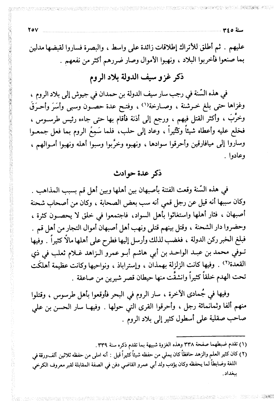 في هذه السنة وقعت الفتنة بأصبهان بين أهلها وبين أهل قم بسبب المذاهب وكان سببها أنه قيل عن رجل قمي أنه سب بعض الصحابة وكان من أصحاب شحنة أصبهان فثار أهلها واستغاثوا بأهل السواد فاجتمعوا في خلق لا يحصون كثرة وحضروا دار الشحنة وقتل بينهم قتلى ونهب أهل أصبهان أموال التجار من أهل قم فبلغ الخبر ركن الدولة فغضب لذلك وأرسل إليها فطرح على أهلها مالا كثيرا وفيها توفي محمد بن عبد الواحد بن أبي هاشم أبو عمرو الزاهد غلام ثعلب في ذي القعدة وفيها كانت الزلزة بهمذان وإستراباذ ونواحيها وكانت عظيمة أهلكت تحت الهدم خلقا كثيرا وانشقت منها حيطان قصر شيرين من صاعقة
