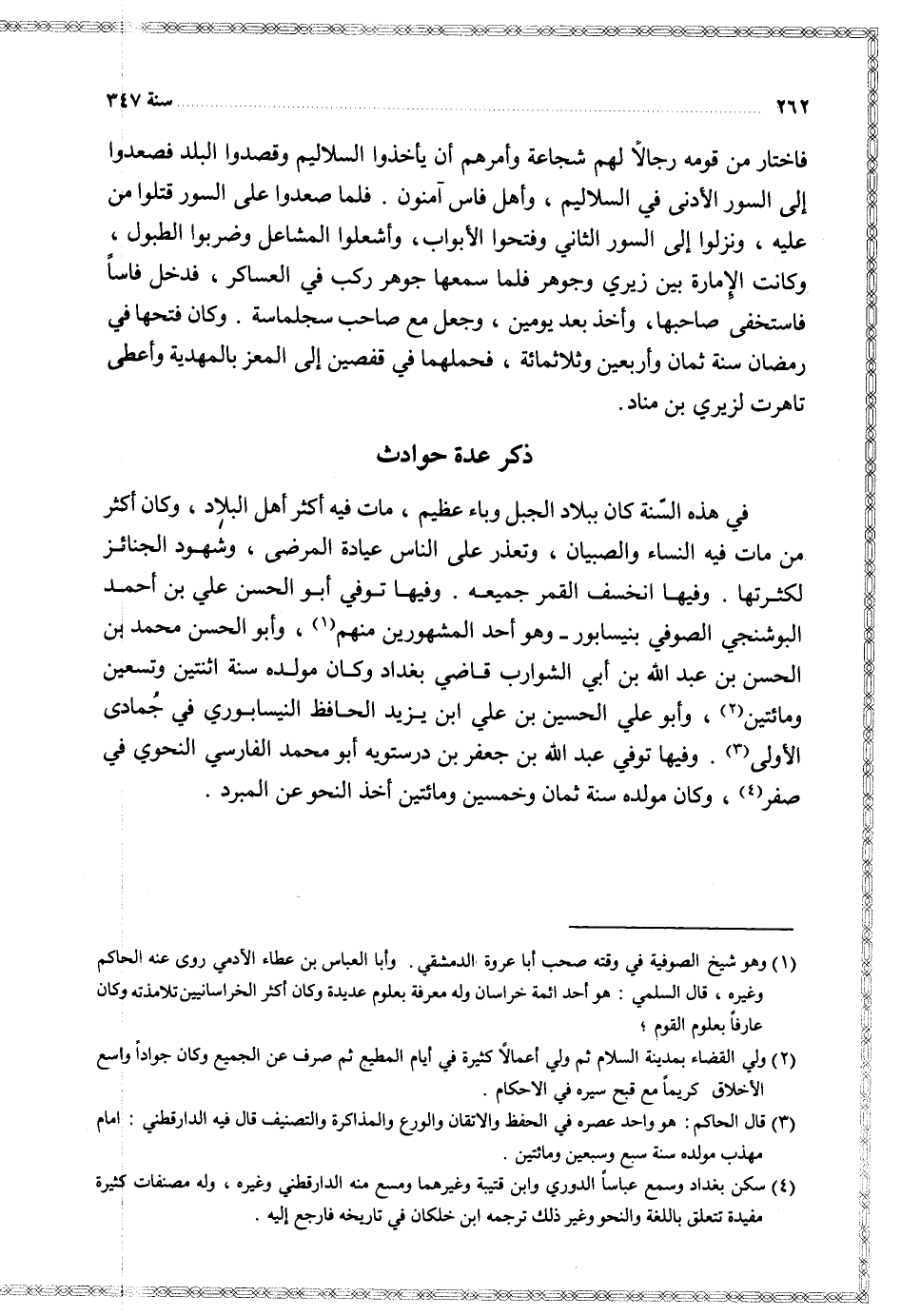 في هذه السنة كان ببلاد الجبل وباء عظيم مات فيه أكثر أهل البلد وكان أكثر من مات فيه النساء والصبيان وتعذر على الناس عيادة المرضى وشهود الجنائز لكثرتها وفيها انخسف القمر جميعه وفيها توفي أبو الحسن علي بن أحمد البوشنجي الصوفي بنيسابور وهو أحد المشهورين منهم وأبو الحسن محمد بن الحسن بن عبد الله بن أبي الشوارب قاضي بغداد وكان مولده سنة اثنتين وتسعين ومائتين وأبو علي الحسين بن علي ابن يزيد الحافظ النيسابوري في جمادى الأولى وفيها توفي عبد الله بن جعفر بن درستويه أبو محمد الفارسي النحوي في صفر وكان مولده سنة ثمان وخمسين ومائتين أخذ النحو عن المبرد