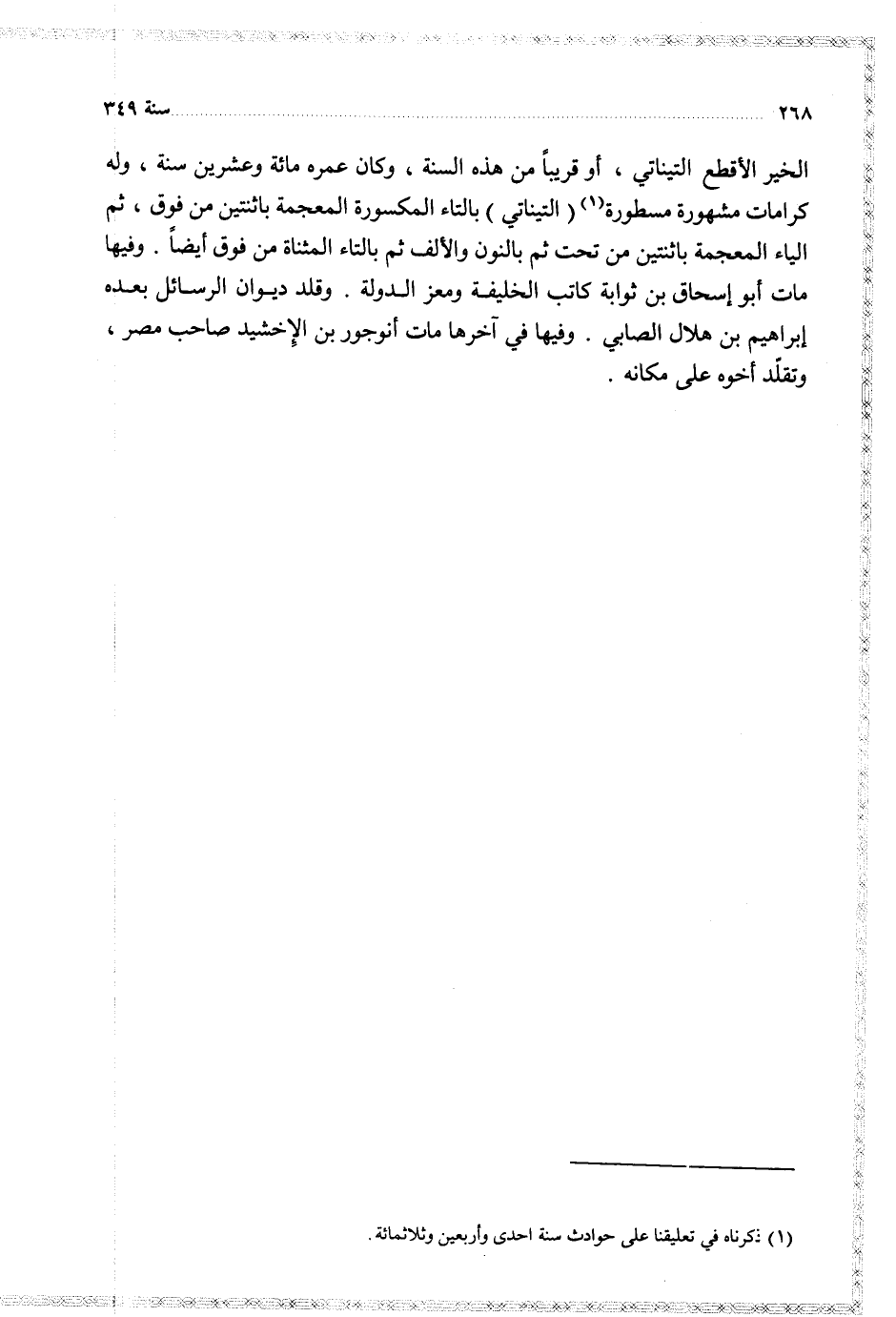الخير الأقطع التيناتي أو قريبا من هذه السنة وكان عمره مائة وعشرين سنة وله كرامات مشهورة مسطورة اليتناتي بالتاء المكسورة المعجمة باثنتين من فوق ثم الياء المعجمة باثنتين من تحت ثم بالنون والألف ثم بالتاء المثناة من فوق أيضا وفيها مات ابو إسحاق بن ثوابه كاتب الخليفة ومعز الدولة وقلد ديوان الرسائل بعده إبراهيم بن هلال الصابي وفيها في آخرها مات أنوجور بن الإخشيد صاحب مصر وتقلد أخوه على مكانه