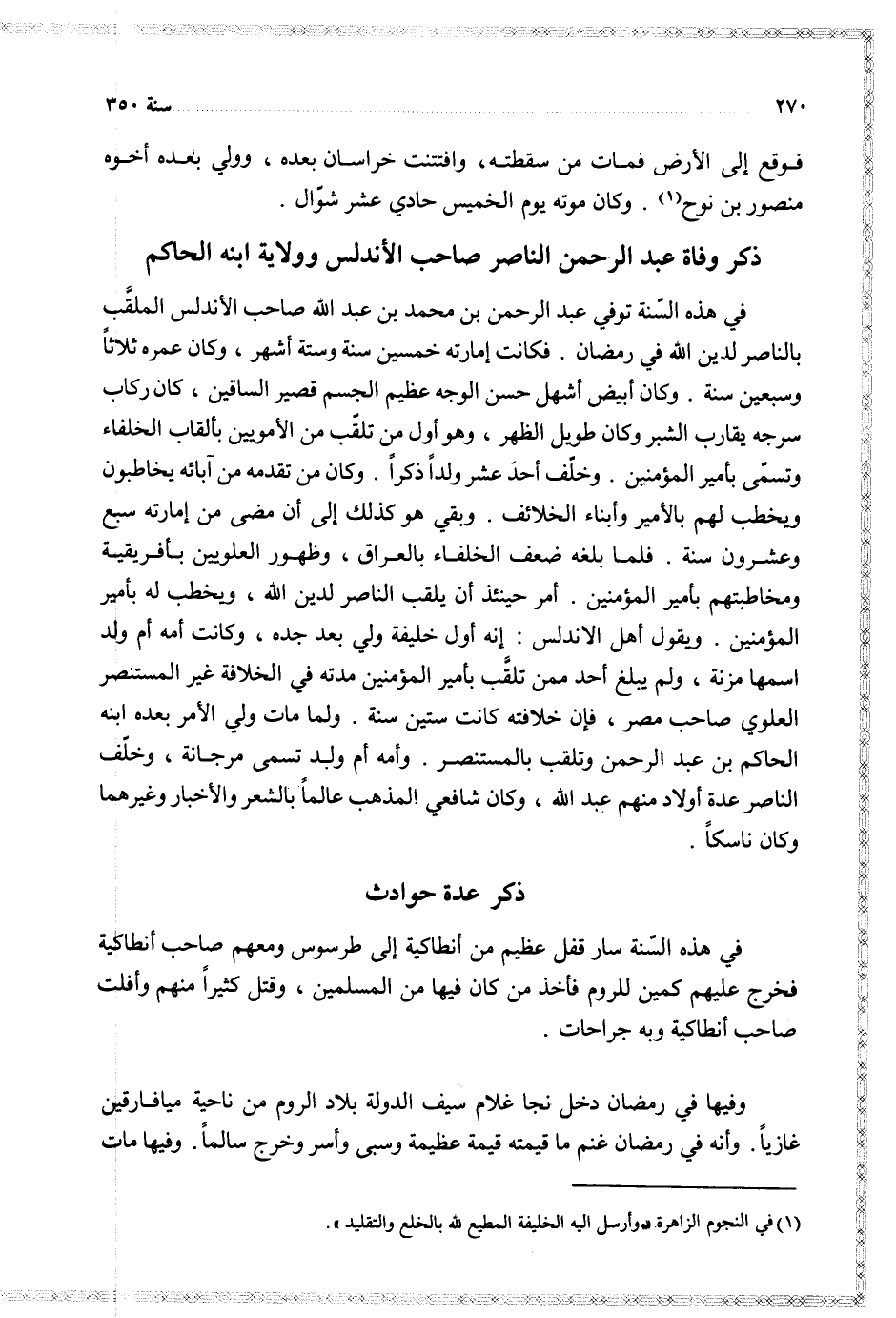 في هذه السنة توفي عبد الرحمن بن محمد بن عبد الله صاحب الأندلس الملقب بالناصر لدين الله في رمضان فكانت إمارته خمسين سنة وستة أشهر وكان عمره ثلاثا وسبعين سنة وكان أبيض أشهل حسن الوجه عظيم الجسم قصير الساقين وكان ركاب سرجه يقارب الشبر وكان طويل الظهر وهو أول من تلقب من الامويين بالقاب الخلفاء وتسمى بأمير المؤمنين وخلف أحد عشر ولدا ذكرا وكان من تقدمه من آبائه يخاطبون ويخطب لهم بالأمير وأبناء الخلائف وبقي هو كذلك إلى أن مضى من إمارته سبع وعشرون سنة فلما بلغه ضعف الخلفاء بالعراق وظهور العلويين بأفريقية ومخاطبتهم بأمير المؤمنين أمر حيننئذ أن يلقب الناصر لدين الله ويخطب له بأمير المؤمنين ويقول أهل الأندلس إنه أول خليفة ولي بعده جده وكانت أمه ام ولد اسمها مزنة ولم يبلغ احد ممن تلقب بأمير المؤمنين مدته في الخلافة غير المستنصر العلوي صاحب مصر فإن خلافته كانت ستين سنة ولما مات ولي الأمر بعده ابنه الحاكم بن عبد الرحمن وتلقب بالمستنصر وأمه ام ولد تسمى مرجانة وخلف الناصر عدة أولاد منهم عبد الله وكان شافغي المذهب عالما بالشعر والأخبار وغيرهما وكان ناسكا