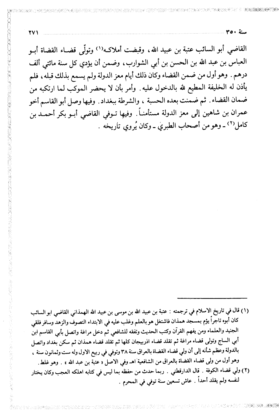 القاضي أبو السائب عتبة بن عبيد الله وقبضت أملاكه وتولى قضاء القضاة أبو العباس بن عبد الله بن الحسن بن أبي الشوارب وضمن أن يؤدي كل سنة مائتي ألف درهم وهو أول من ضمن القضاء وكان ذلك أيام معز الدولة ولم يسمع بذلك قبله فلم يأذن له الخليفة المطيع لله بالدخول عليه وأمر بأن لا يحضر الموكب لما ارتكبه من ضمان القضاء ثم ضمنت بعده الحسبة والشرطة ببغداد وفيها وصل أبو القاسم أخو عمران بن شاهين إلى معز الدولة مستأمنا وفيها توفي القاضي أبو بكر أحمد بن كامل وهو من أصحاب الطبري وكان يروي تاريخه