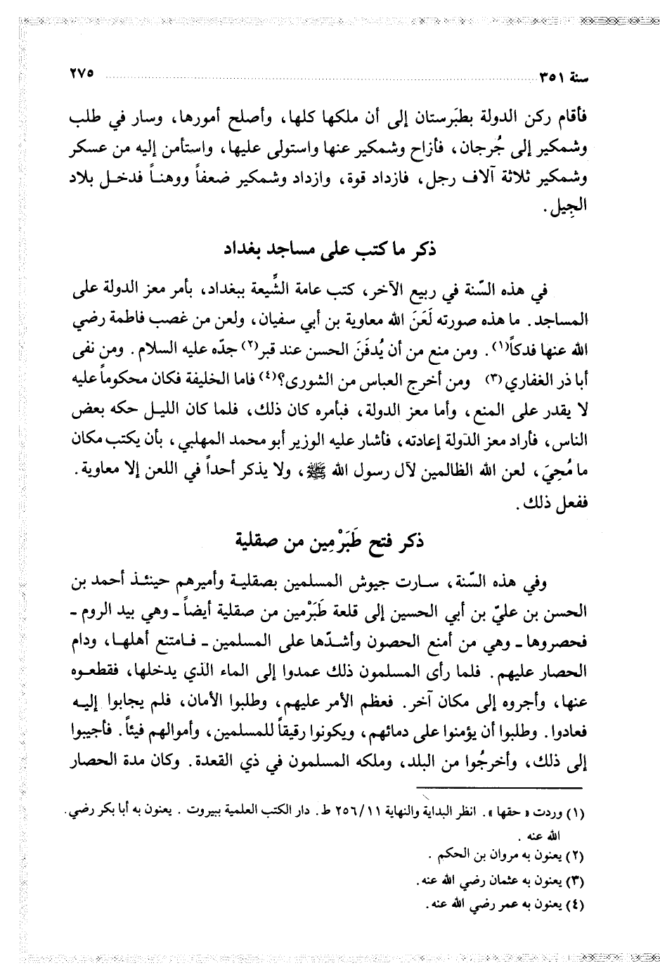 في هذه السنة في ربيع الآخر كتب عامة الشيعة ببغداد بأمر معز الدولة على المساجد ما هذه صورته لعن الله معاوية بن أبي سفيان ولعن من غضب فاطمة رضي الله عنها فدكا ومن منع من أن يدفن الحسن عند قبر جده عليه السلام ومن نفى أبا ذر الغفاري ومن أخرج العباس من الشورى فاما الخليفة قكان محكوما عليه لا يقدر على المنع وأما معز الدولة فبأمره كان ذلك فلما كان الليل حكه بعض الناس فأراد معز الدولة إعادته فأشار عليه الوزير أبو محمد المهلبي بان يكتب مكان ما محيي لعن الله الظالمين لآل رسول الله ولا يذكر أحدا في اللعن إلا معاوية ففعل ذلك