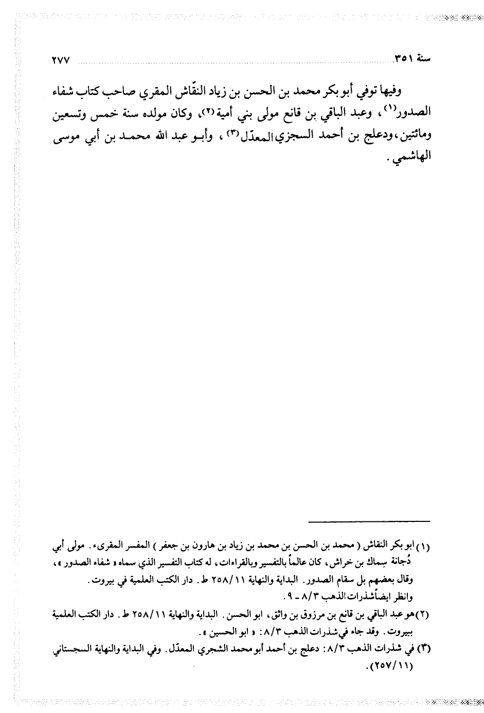 وفيها توفي أبو بكر محمد بن الحسن بن زياد النقاش المقري صاحب كتاب شفاء الصدور وعبد الباقي بن قانغ مولى بني أمية وكان مولده سنة خمس وتسعين ومائتين ودعلج بن أحمد السجزي المعدل وأبو عبد الله محمد بن أبي موسى الهاشمي