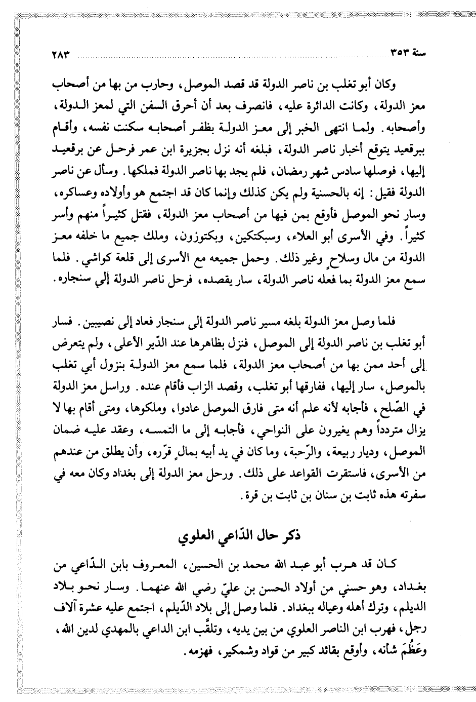 وكان أبو تغلب بن ناصر الدولة قد قصد الموصل وحارب من بها من أصحاب معز الدولة وكانت الدائرة عليه فانصرف بعد أن أحرق السفن التي لمعز الدولة وأصحابه ولما انتهى الخبر إلى معز الدولة بظفر أصحابه سكنت نفسه وأقام ببرقعيد يتوقع أخبار ناصر الدولة فبلغه أنه نزل بجزيرة ابن عمر فرحل عن ببرقعيد إليها فوصلها سادس شهر رمضان فلم يجد بها ناصر الدولة فملكها وسأل عن ناصر الدولة فقيل انه بالحسنية ولم يكن كذلك وانما كان قد اجتمع هو وأولاده وعساكره وسار نحو الموصل فأوقع بمن فيها من أصحاب معز الدولة فقتل كثيرا منهم وأسر كثيرا وفي الأسرى أبو العلاء وسبكتكين وبكتوزون وملك جميع ما خلفه معز الدولة من مال وسلاح وغير ذلك وحمل جميعه مع الأسرى إلى قلعة كواشي فلما سمع معز الدولة بما فعله ناصر الدولة سار يقصده فرحل ناصر الدولة إلى سنجاره