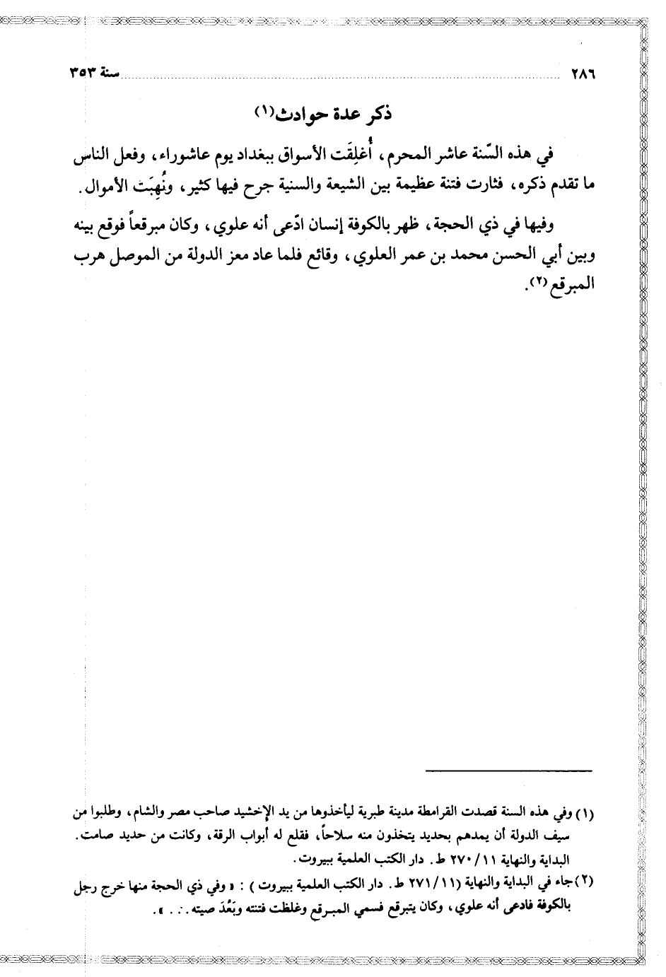 في هذه السنة عاشر المحرم أغلقت الأسواق ببغداد يوم عاشوراء وفعل الناس ما تقدم ذكره فثارت فتنة عظيمة بين الشيعة والسنية جرح فيهل كثير ونهبت الأموال