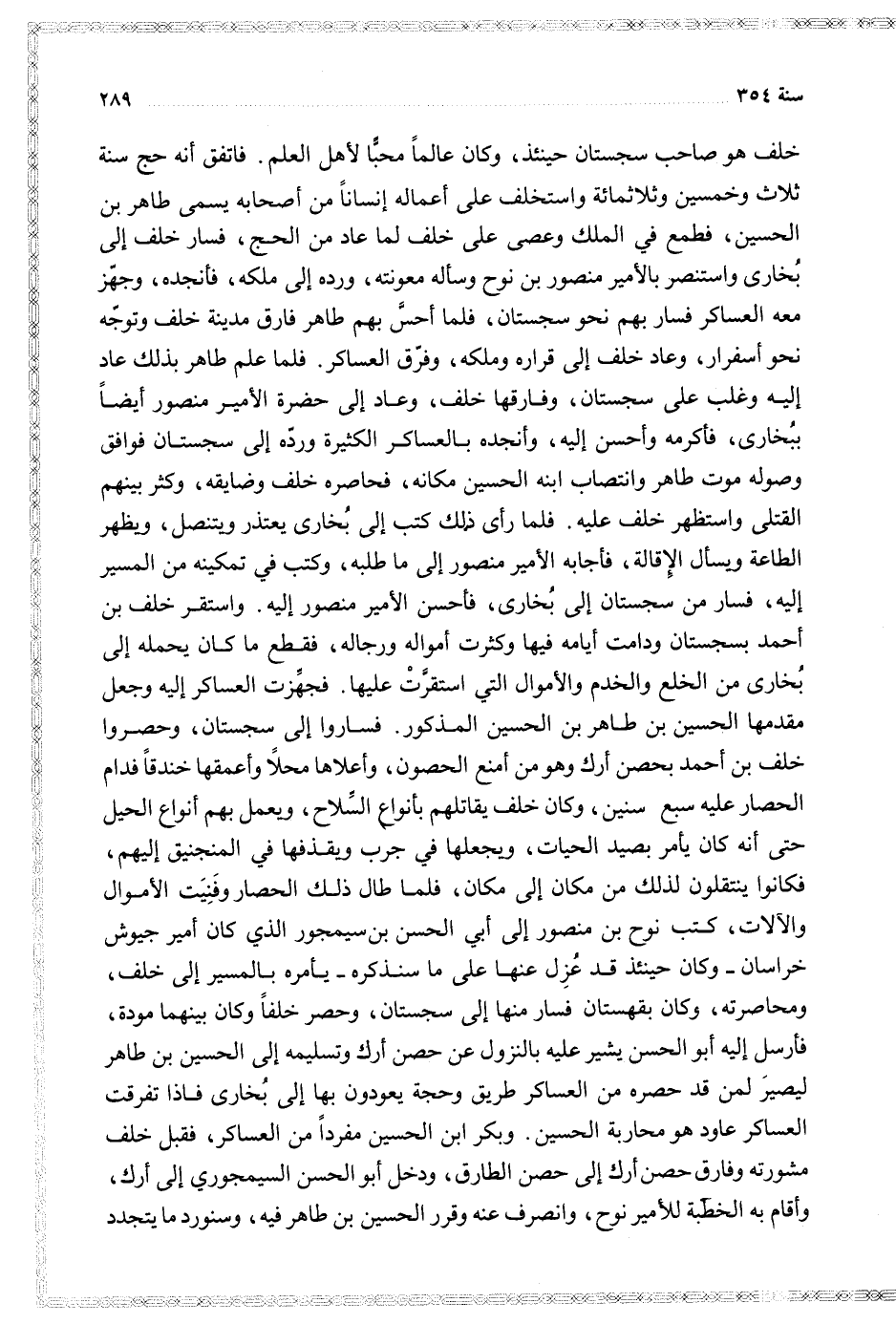 خلف هو صاحب سجستان حيننئذ وكان عالما محبا لأهل العلم فاتفق أنه حج سنة ثلاث وخمسين وثلاثمائة واستخلف على أعماله إنسانا من أصحابه يسمى طاهر بن الحسين فطمع في الملك وعصى على خلف لما عاد من الحج فسار خلف إلى بخارى واستنصر بالأمير منصور بن نوح وسأله معونته ورده إلى ملكه فأنجده وجهز معه العساكر فسار بهم نحو سجستان فلما أحس بهم طاهر فارق مدينة خلف وتوجه نحو أسفرار وعاد خلف إلى قراره وملكه وفرق العساكر فلما علم طاهر بذلك عاد إليه وغلب على سجستان وفارقها خلف وعاد إلى حضرة الأمير منصور أيضا ببخارى فأكرمه وأحسن إليه وأنجده بالعساكر الكثيرة ورده إلى سجستان فوافق وصوله موت طاهر وانتصاب ابنه الحسين مكانه فحاصره خلف وضايقه وكثر بينهم القتلى واستظهر خلف عليه فلما رأى ذلك كتب إلى بخارى يعتذر وينتصل ويظهر الطاعة ويسال الإقالة فأجابه الأمير منصور إلى ما طلبه وكتب في نمكينه من المسير إليه فسار من سجستان إلى بخارى فأحسن الأمير منصور إليه واستقر خلف بن أحمد بسجستان ودامت أيامه فيها وكثرت أمواله ورجاله فقطع ما كان يحمله إلى بخارى من الخلع والخدم والأموال التي استقرت عليها فجهزت العساكر إليه وجعل مقدمها الحسين بن طاهر بن الحسين المذكور فساروا إلى سجستان وحصروا خلف بن أحمد بحصن أرك وهو من أمنع الحصون وأعلاها محلا وأعمقها خندقا فدام الحصار عليه سبع سنين وكان خلف يقاتلهم بأنواع السلاح ويعمل بهم أنواع الحيل حتى أنه كان يأمر بصيد الحيات ويجعلها في جرب ويقذفها في النجنيق إليهم فكانوا يتنقلون لذلك من مكان إلى مكان فلما طال ذلك الحصار وفنيت الأموال والآلات كتب نوح بن منصور إلى أبي الحسن بن سيمجور الذي كان أمير جيوش خراسان وكان حيننئذ قد عزل عنها على ما سنذكره يأمره بالمسير إلى خلف ومحاصرته وكان بقهستان فسار منها إلى سجستان وحصر خلفا وكان بينهما مودة فأرسل إليه أبو الحسن يشير عليه بالنزول عن حصن أرك وتسليمه إلى الحسين بن طاهر ليصير لمن قد حصره من العساكر طريق وحجة يعودون بها إلى بخارى فاذا تفرقت العساكر عاود هو محاربة الحسين وبكر ابن الحسين مفردا من العساكر فقبل خلف مشورته وفارق حصن أرك إلى حصن الطارق ودخل أبو الحسين السيمجوري إلى أرك وأقام به الخطبة الأمير نوح وانصرف عنه وقرر الحسين بن طاهر فيه وسنورد ما يتجدد