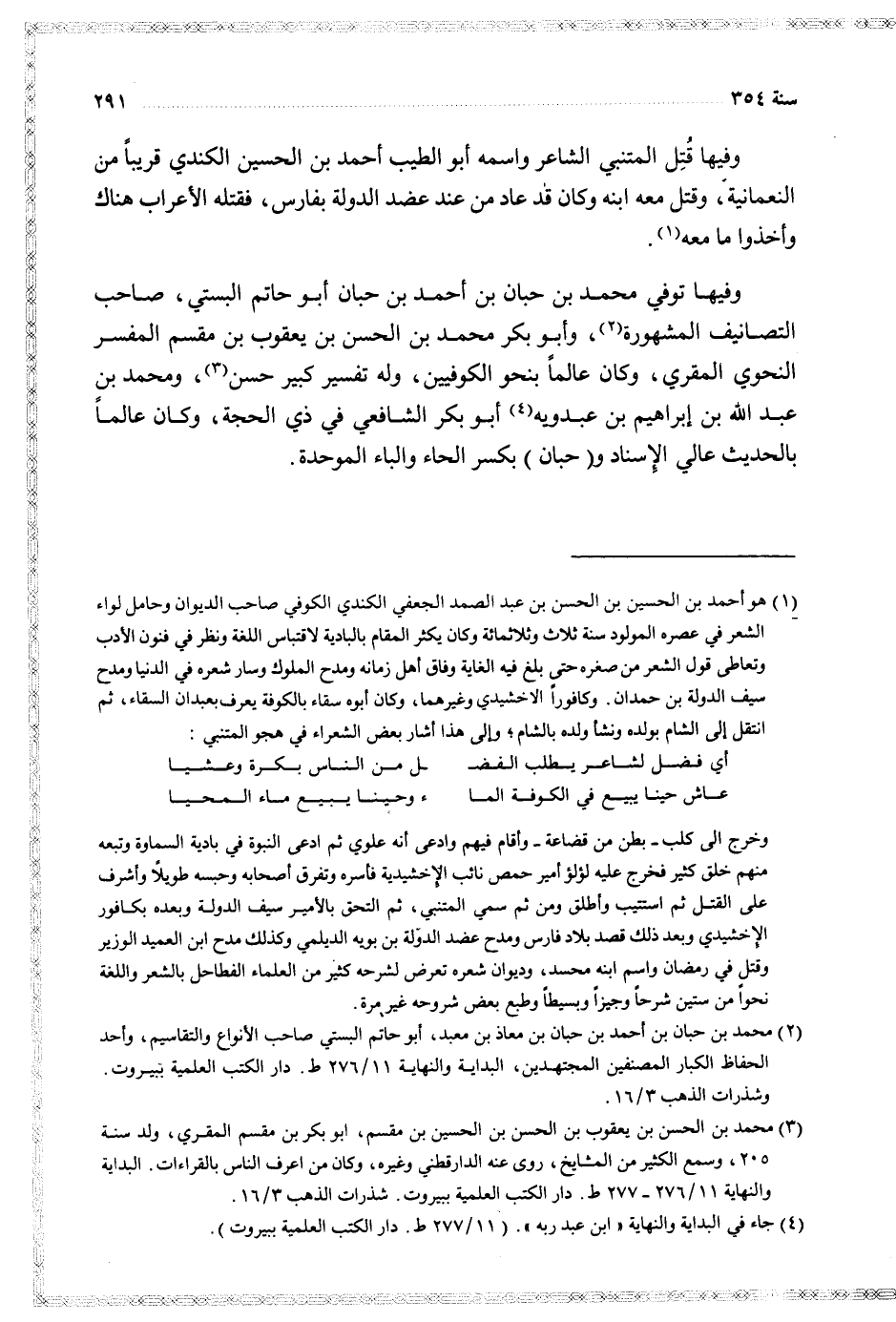 وفيها توفي محمد بن حبان بن أحمد بن حبان أبو حاتم البستي صاحب التصانيف المشهورة وأبو بكر محمد بن الحسن بن يعقوب بن مقسم المفسر النحوي المقري وكان عالما بنحو الكفيين وله تفسير كبير حسن ومحمد بن عبد الله بن إبراهيم بن عبدويه أبو بكر الشافعي في ذي الحجة وكان عالما بالحديث عالي الإسناد وحبان بكسر الحاء والباء الموحدة